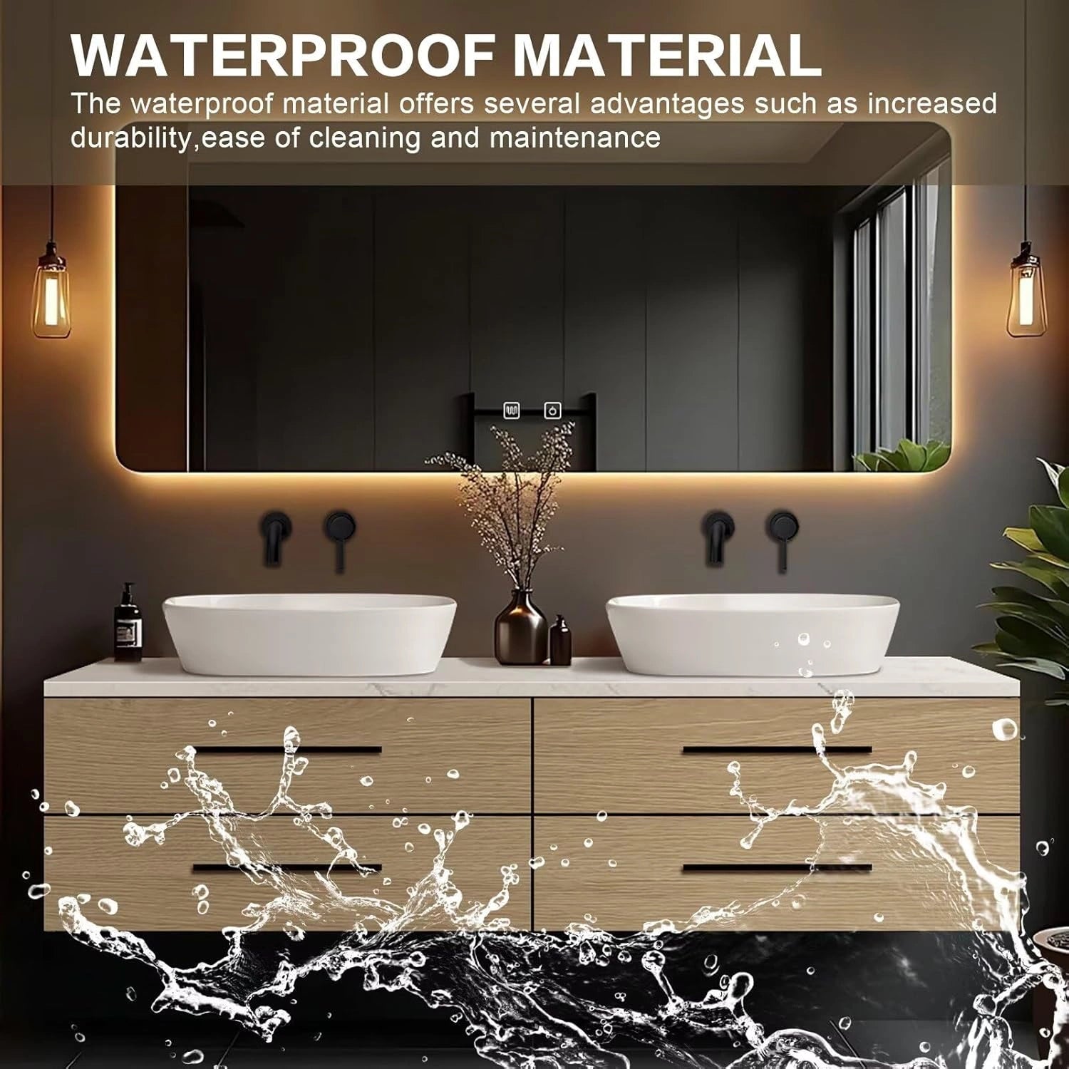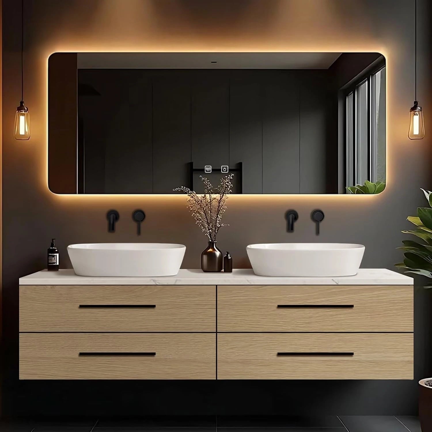 Large Rectangular Makeup Mirror: Features an oversized mirror that enhances the user experience, with touch buttons, built-in lighting, and defogging function, offering clear reflection and added convenience for grooming needs