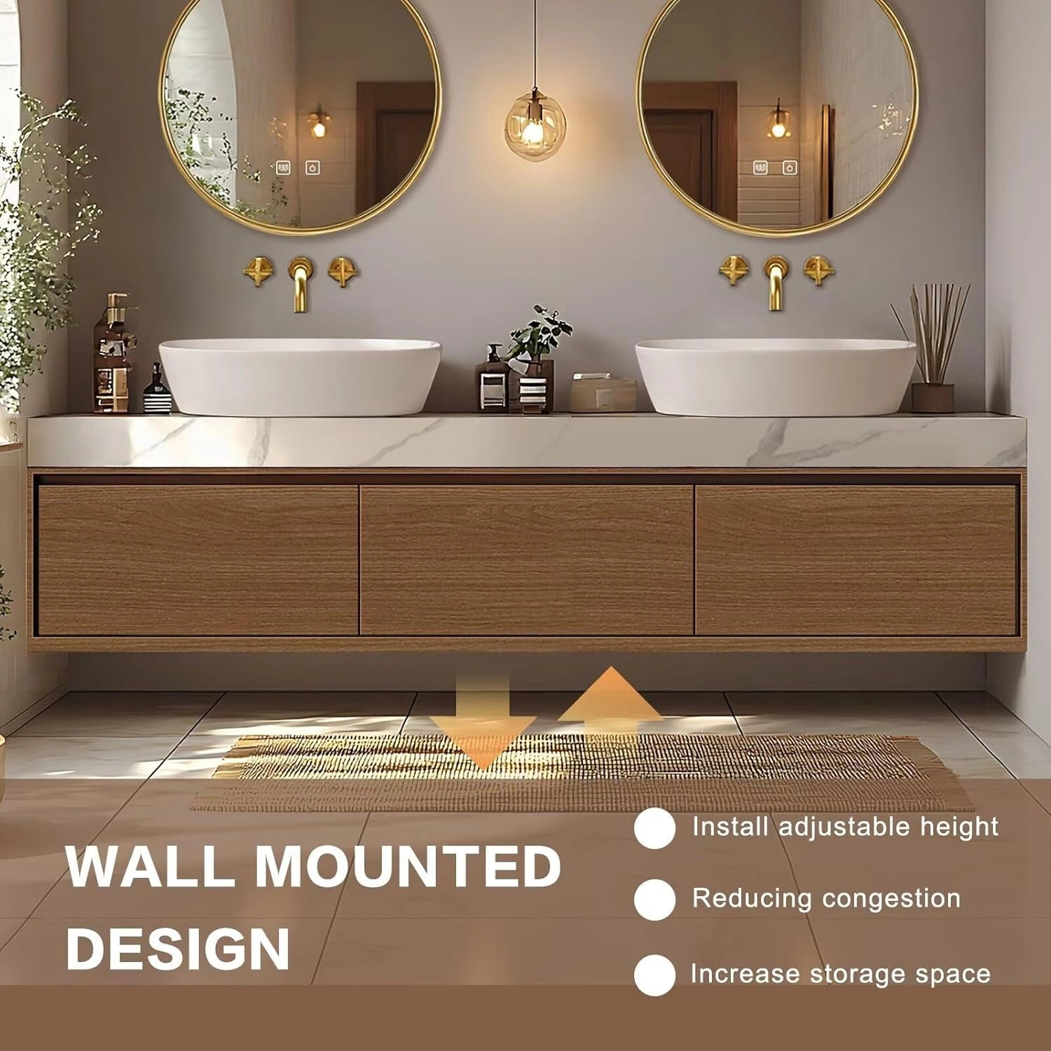 Elaborate Layout: Simple and stylish modern design with a symmetrical layout. Round gold-rimmed mirrors, white square basins, and light wood cabinets that bring a warm, natural feel combine to create a comfortable and practical washing space.