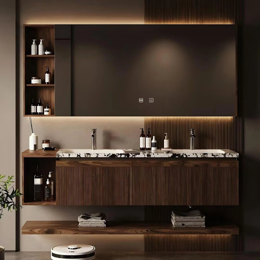 Modern Luxury: Deep, rich brown wood paired with a stone slab countertop and sleek floating cabinet lines. The design blends understated opulence with contemporary spatial aesthetics.