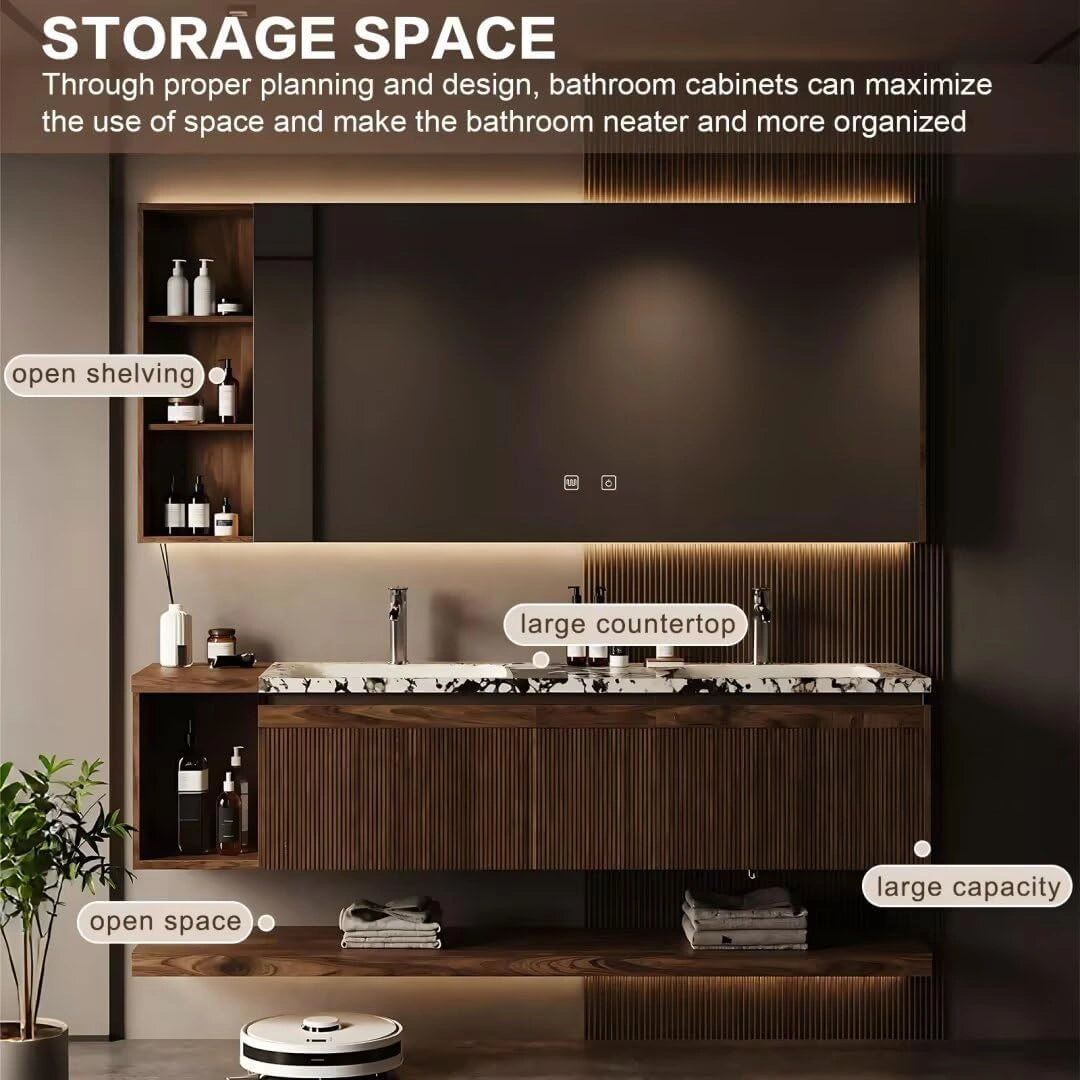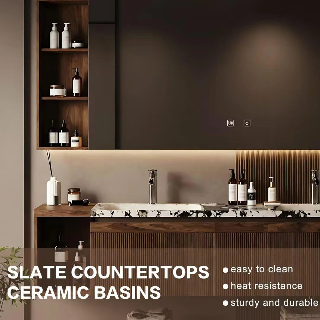 Dual Sink: The double-basin design allows two people to use the vanity at the same time, saving time during your daily routine. The stone slab countertop features a seamless texture that perfectly combines beauty and functionality.