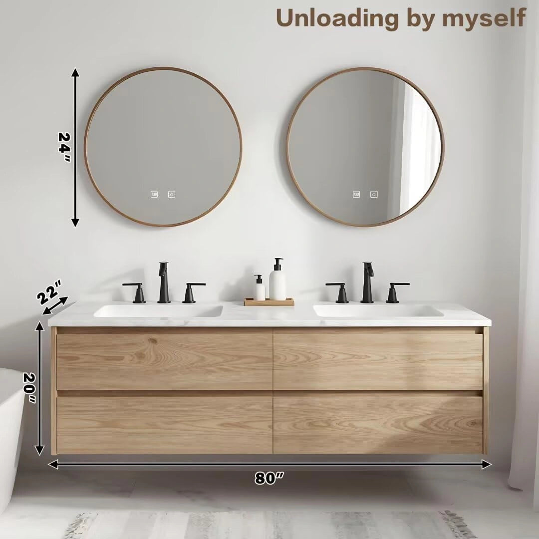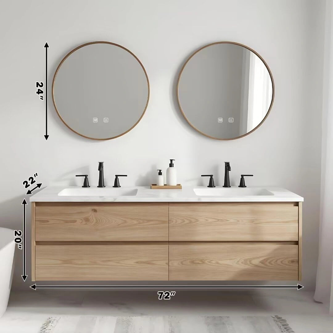 Nordic Rustic Style: Light wood-toned cabinetry with white countertops brings a soft, natural texture. The wall-mounted design, paired with a double-ring wooden frame mirror, creates an overall fresh and relaxed aesthetic.