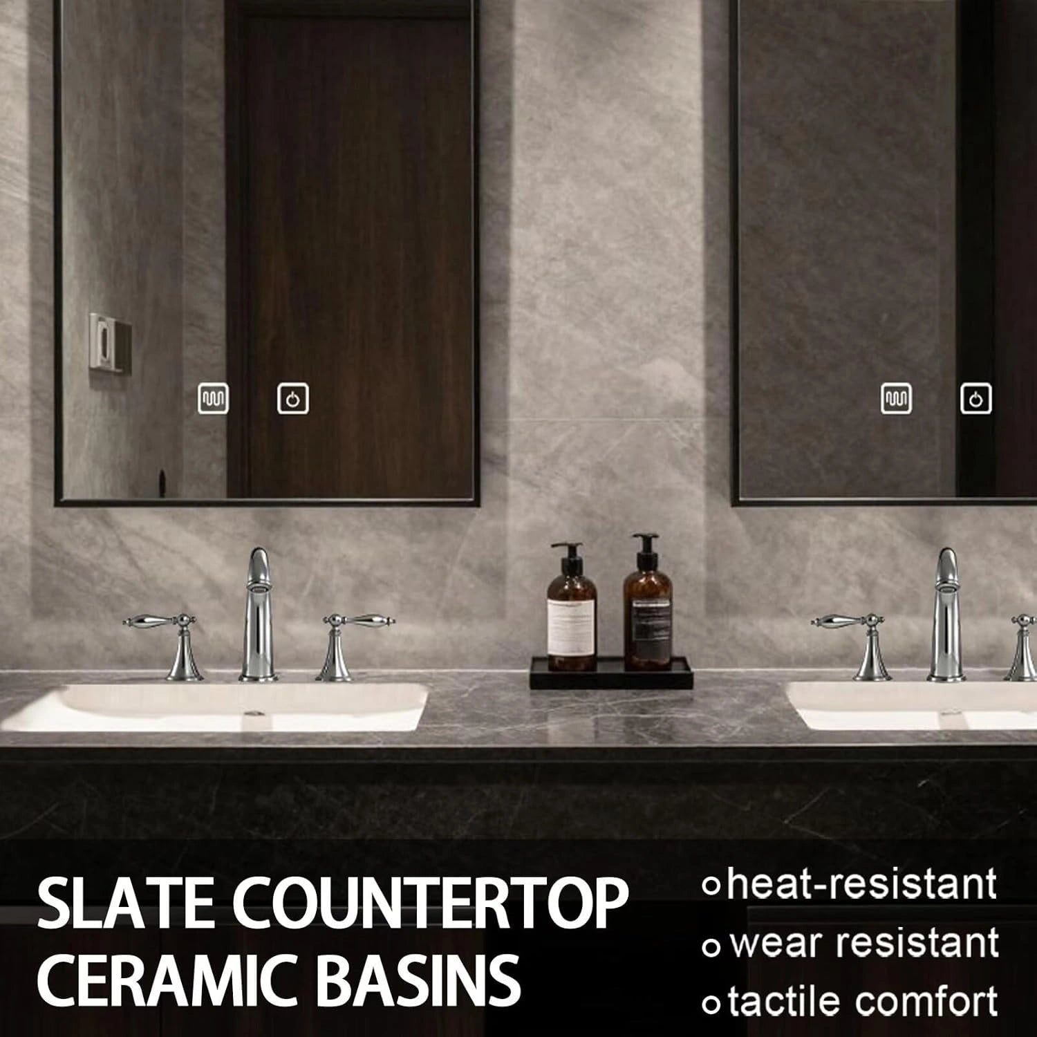 Slate & Ceramic Countertop: A crisp dark slate countertop supports two sturdy ceramic basins, creating a unified, sleek surface with discreet functional areas for two users.