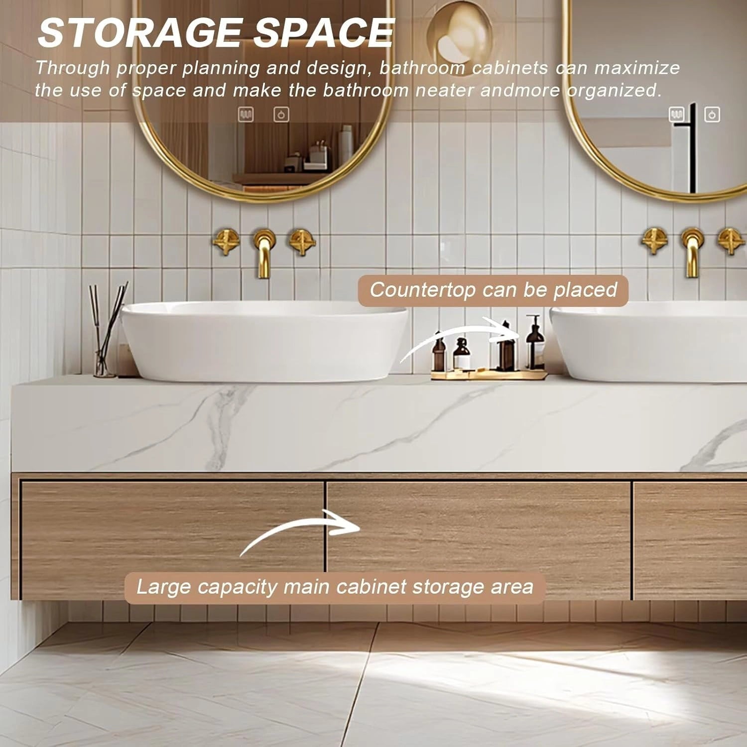 Modern Warm Style: The light brown log-style cabinets are combined with a white washbasin. The quaint texture of the countertop brings a simple and clean visual effect; the gold-framed mirror is full of quality and luxury.