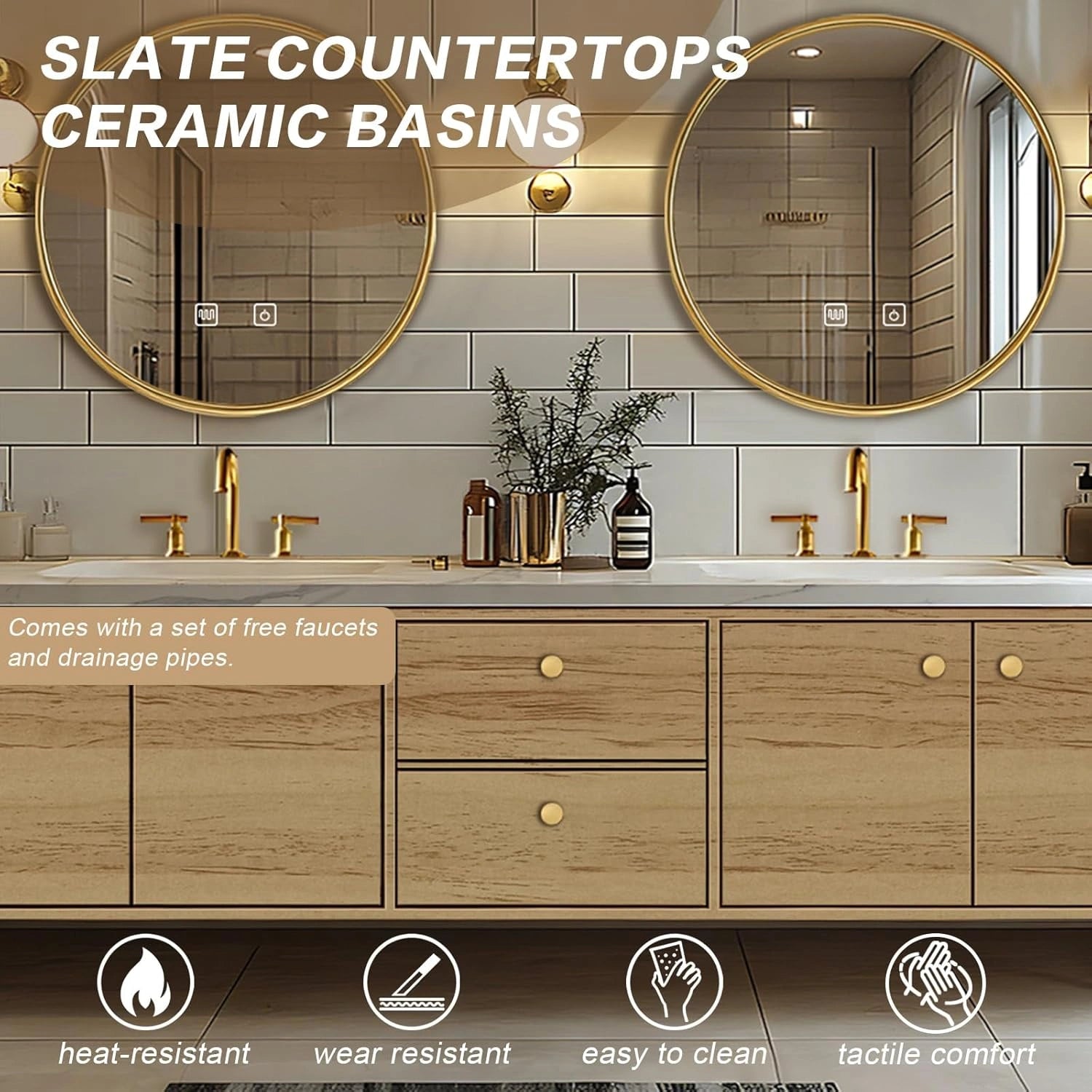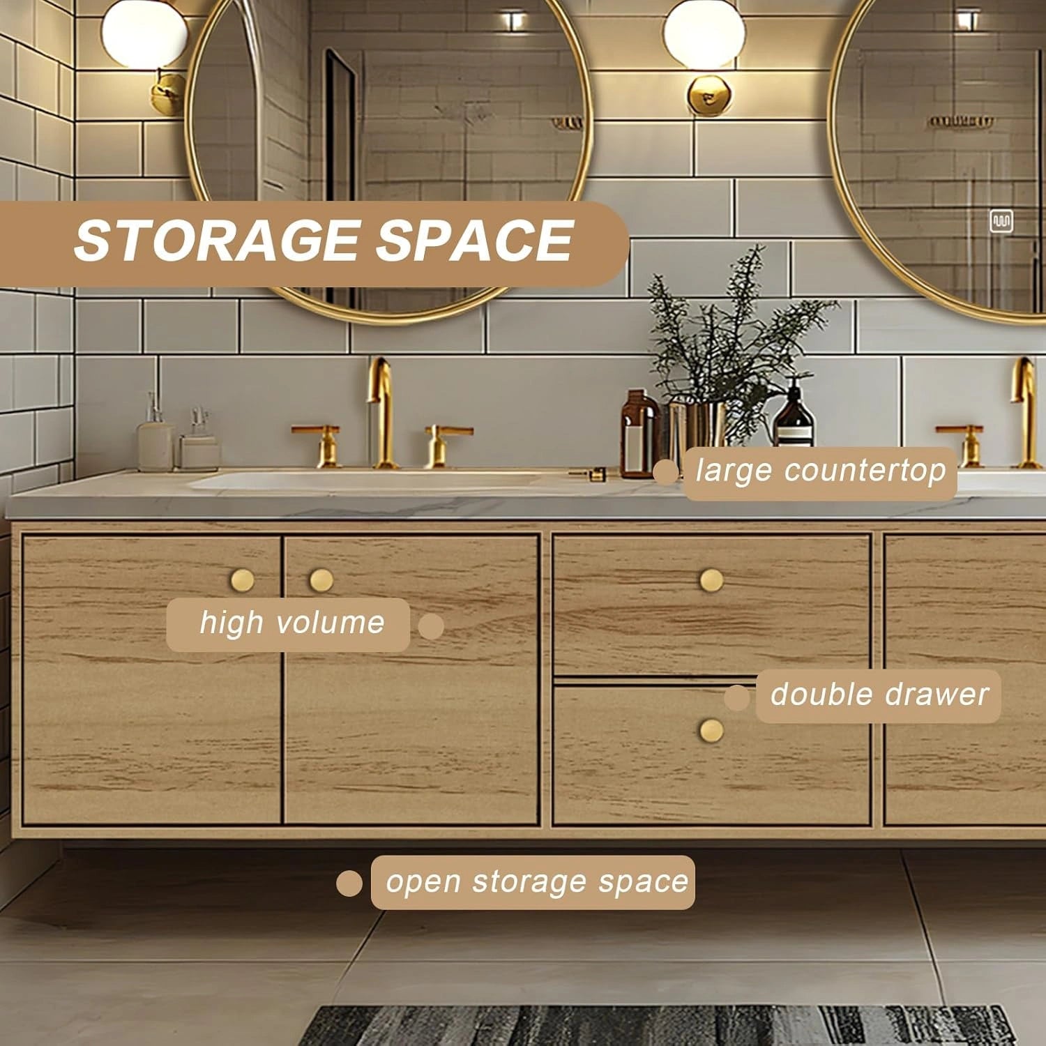 Double-Sink Design: Designed with modern living needs in mind, our double-sink configuration is a game-changer for busy households. It allows multiple family members to use the vanity simultaneously during hectic mornings, significantly boosting your daily grooming efficiency.