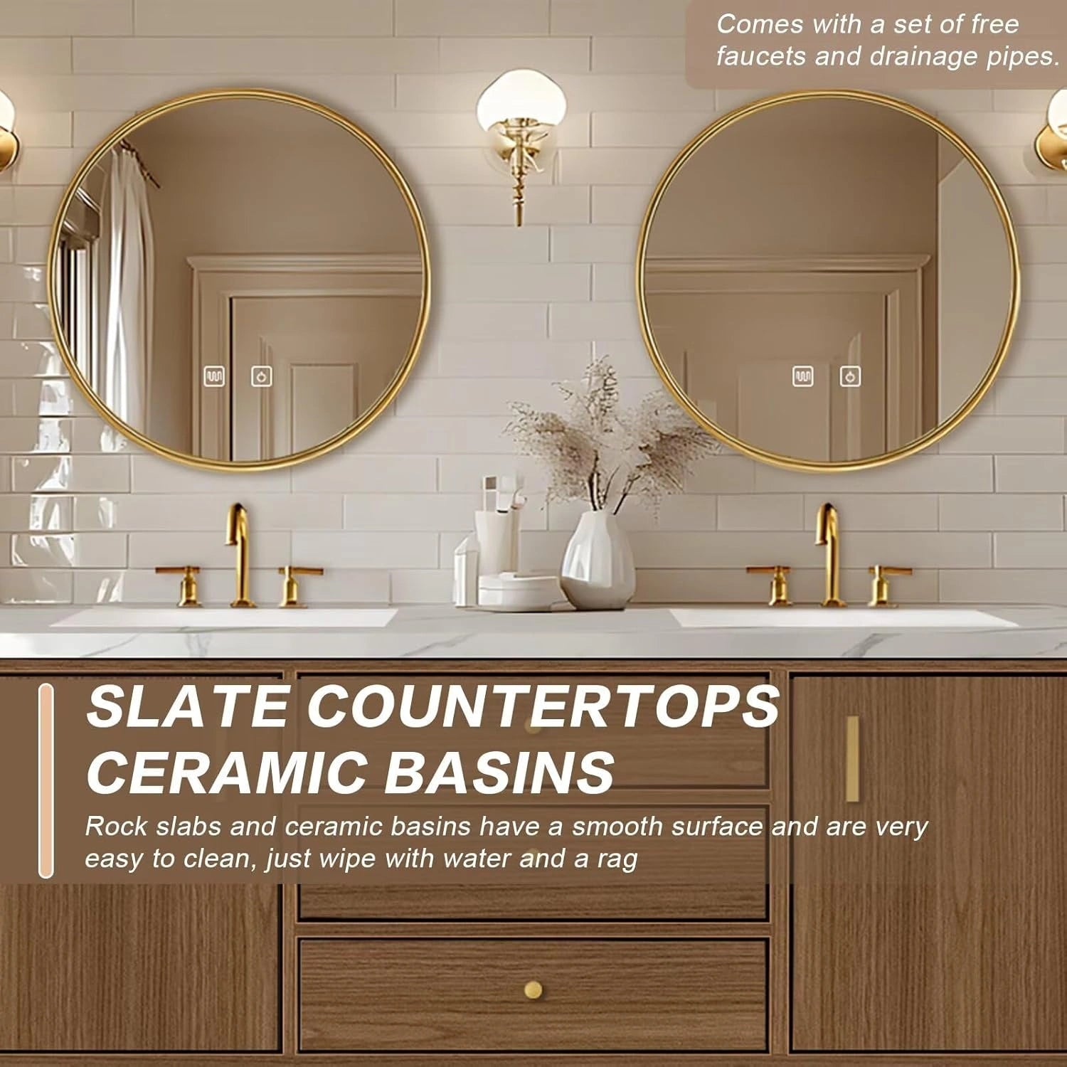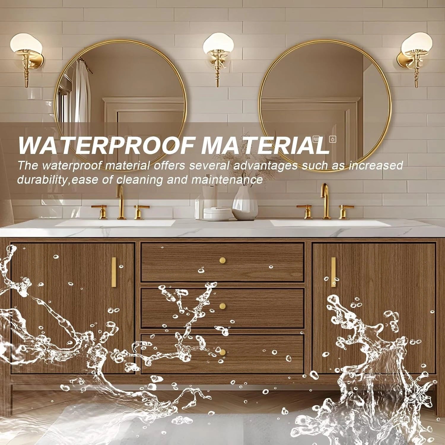 LED Smart Mirrors: Both large mirrors come equipped with integrated lighting and intelligent defogging functions. With the touch control buttons, you can adjust the lighting and quickly clear fog from the mirror surface, delivering a convenient and comfortable grooming experience.
