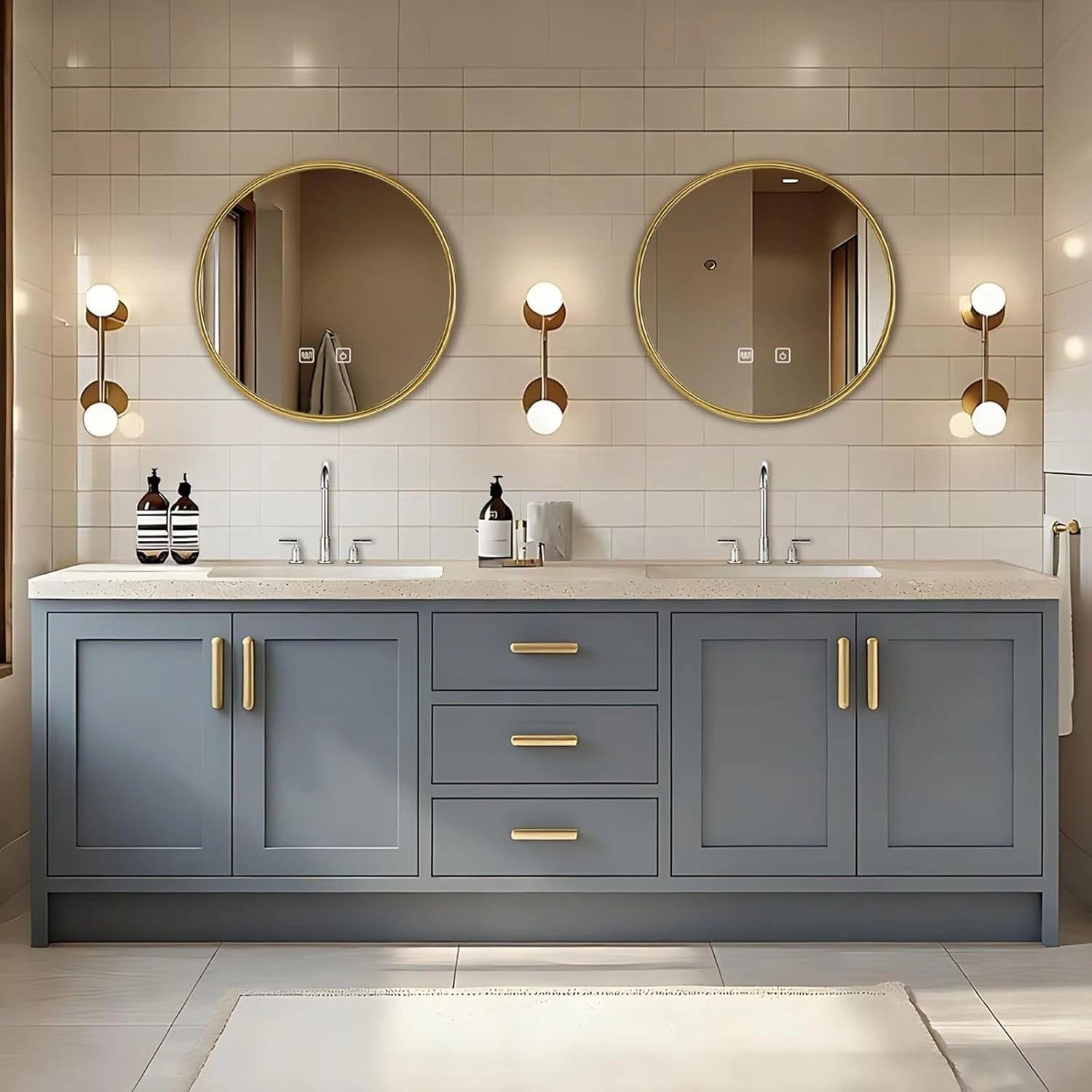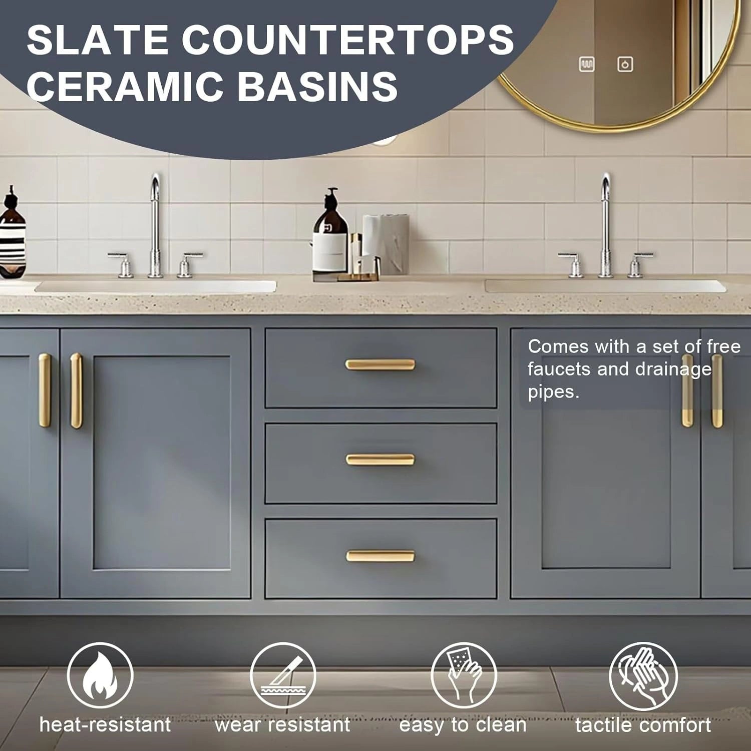 American Light Luxury Style: Textured slate countertop paired with ceramic basins create a premium feel. Gold and silver accents add a touch of sophistication. Create elegant and comfortable ambiance