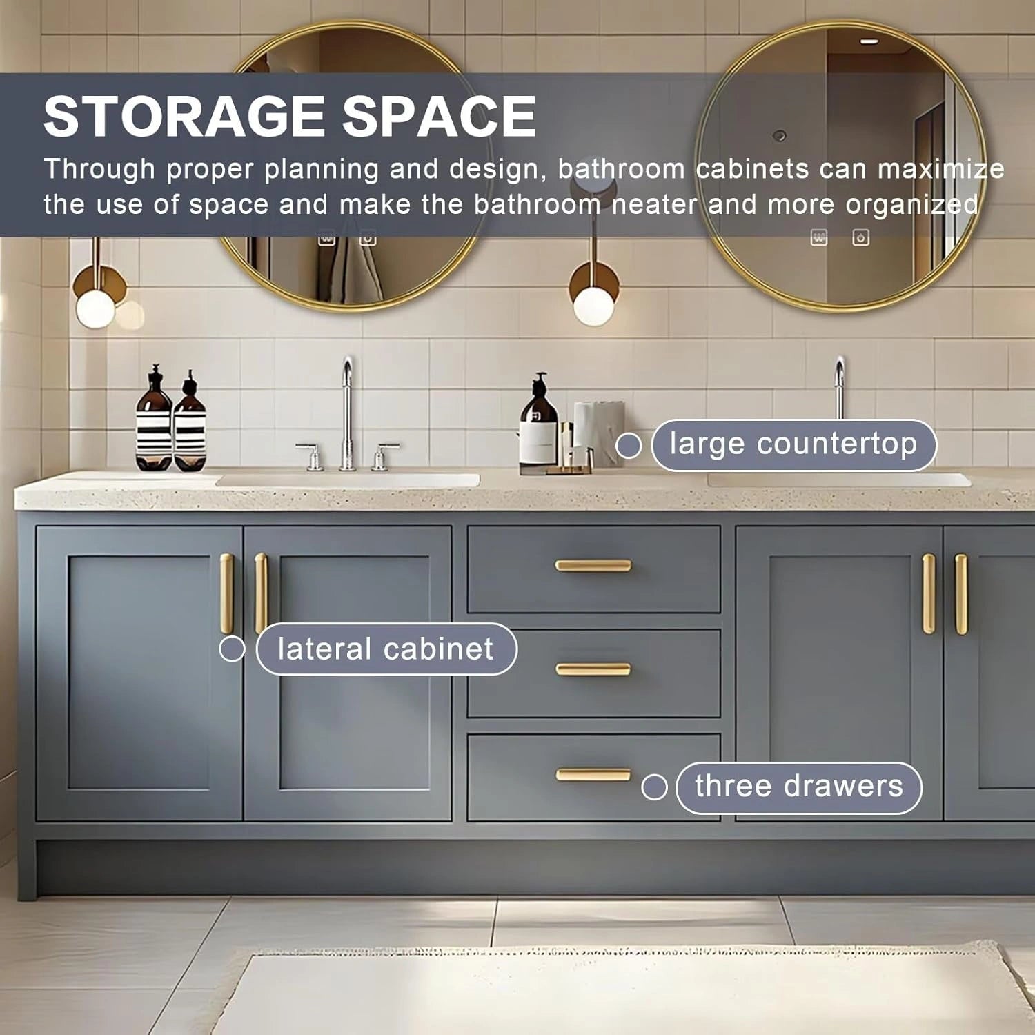 Space Utilization: The bathroom cabinet is cleverly planned and designed to maximize space utilization. The spacious countertop provides convenient storage for toiletries, while multiple drawers provide categorized storage for various items