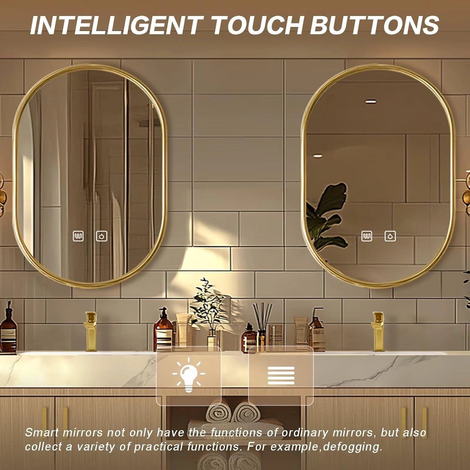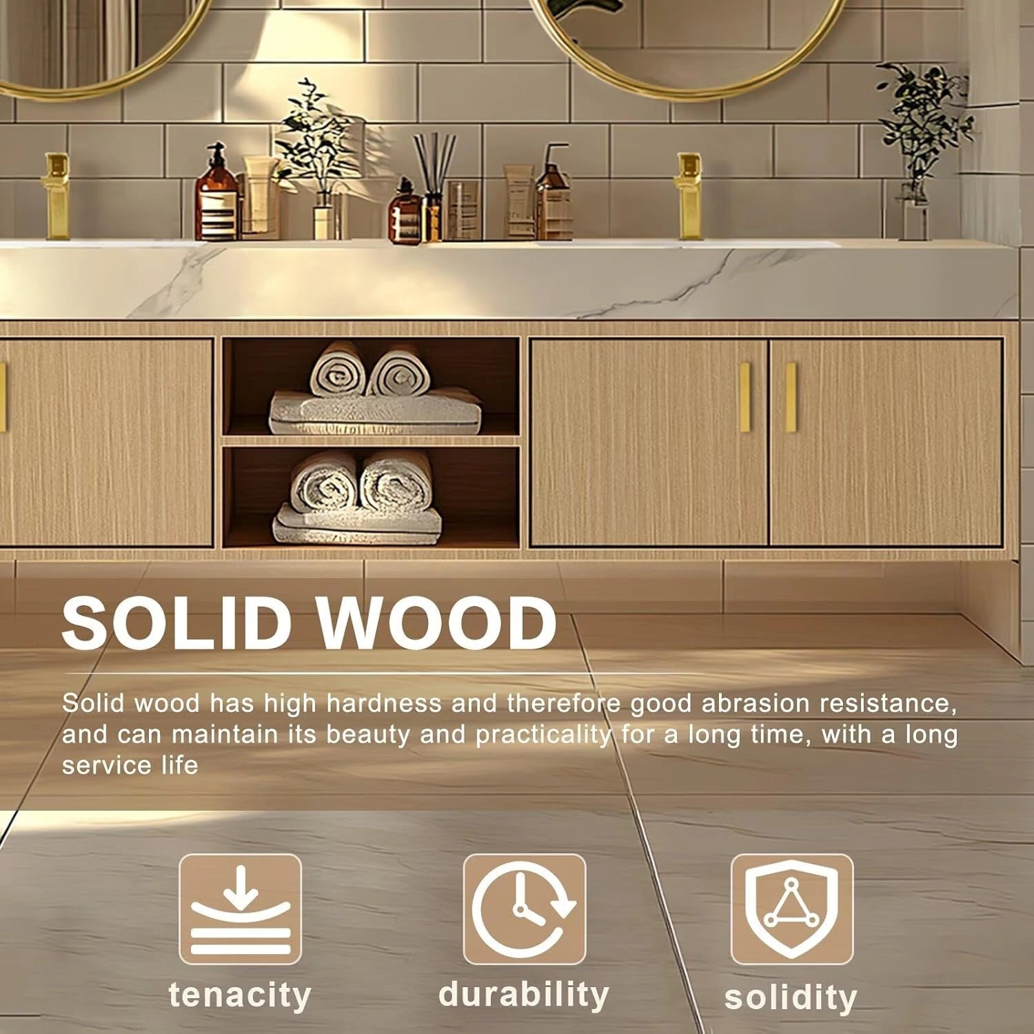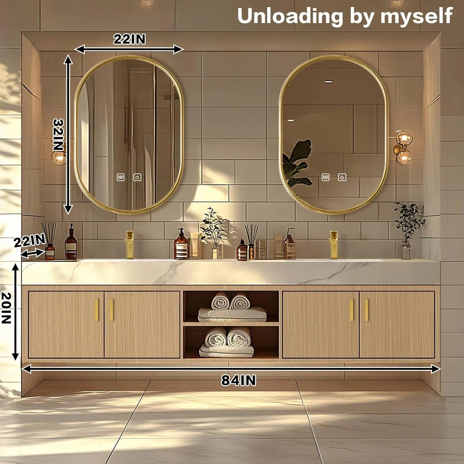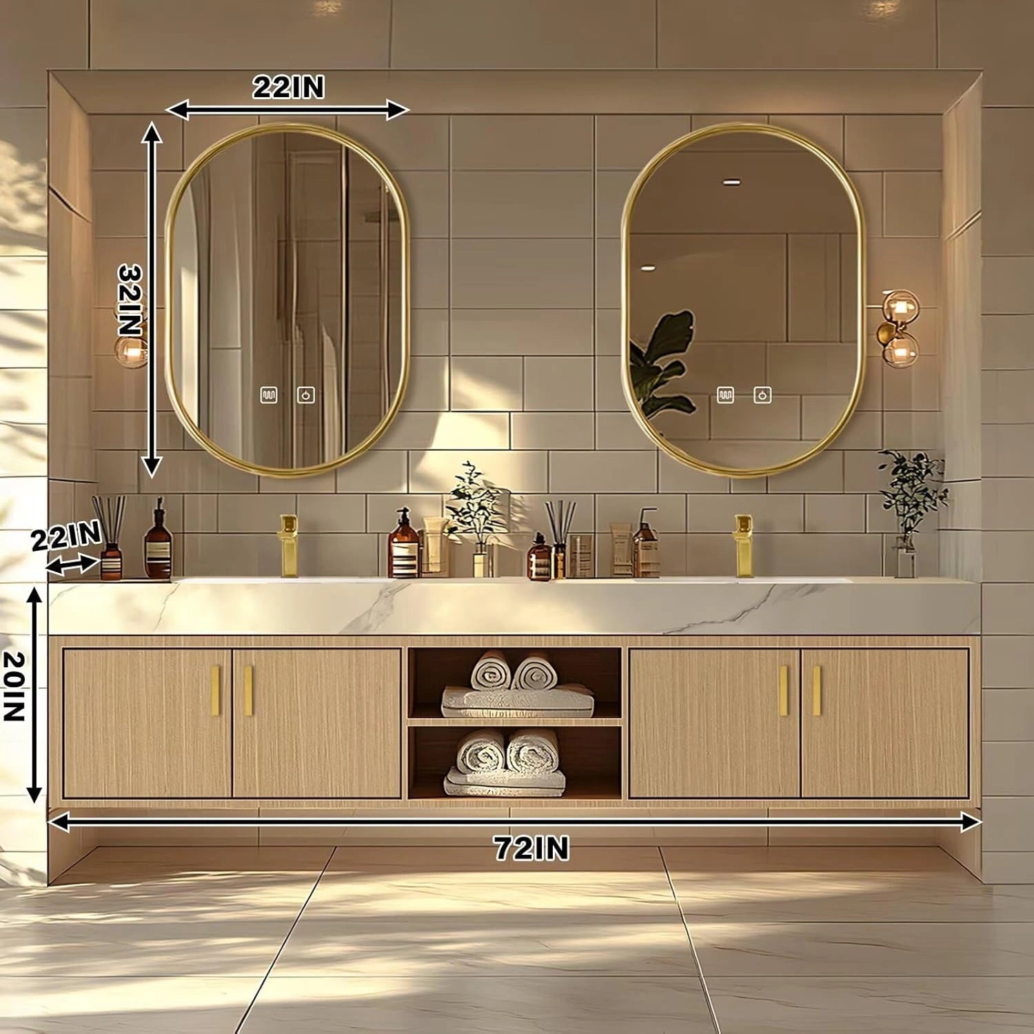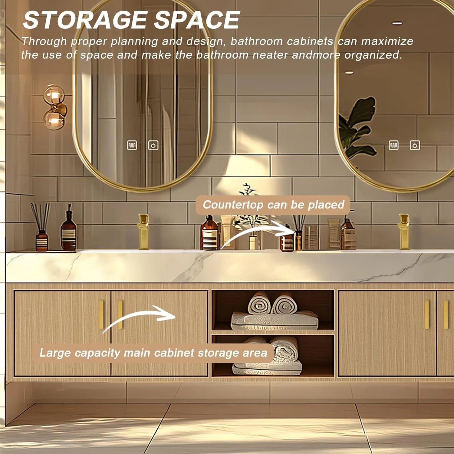 Simple Luxury Style: Warm beige and gold colors match to create a warm and elegant style. The double oval gold-rimmed mirrors are round and soft, while a light wood cabinet with gold knobs is minimalist and refined. Together, they bring a clean, simple and elegant vibe.