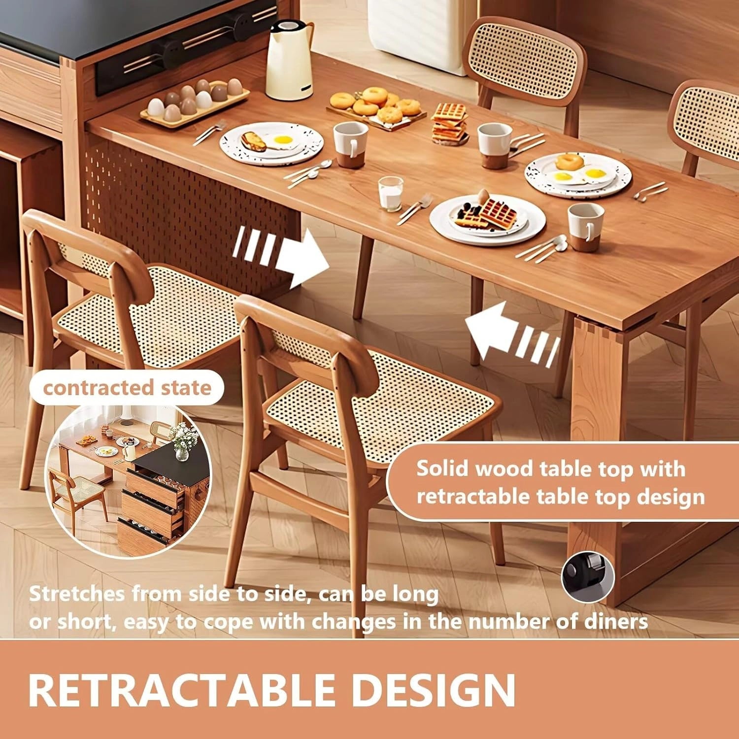 Pull-Out Dining Table: The island and table form a seamless one-piece unit with an adjustable tabletop size, saving space for everyday use. The pull-out design lets you extend the table effortlessly when hosting large gatherings, perfectly meeting your needs for bigger dining parties.