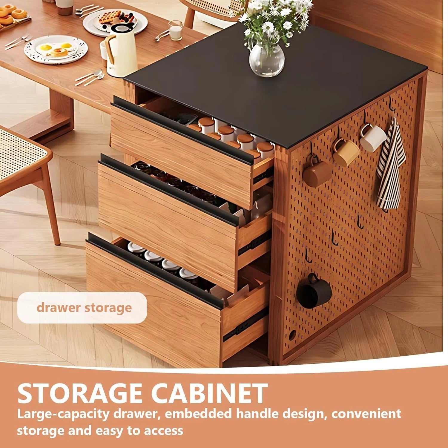Abundant Storage Space: One side features 3 drawers for classified item storage, while the other is equipped with an open storage compartment for quick and easy access to your essentials. The hollow hanging shelf is ideal for hanging towels, cups and other small kitchenware.