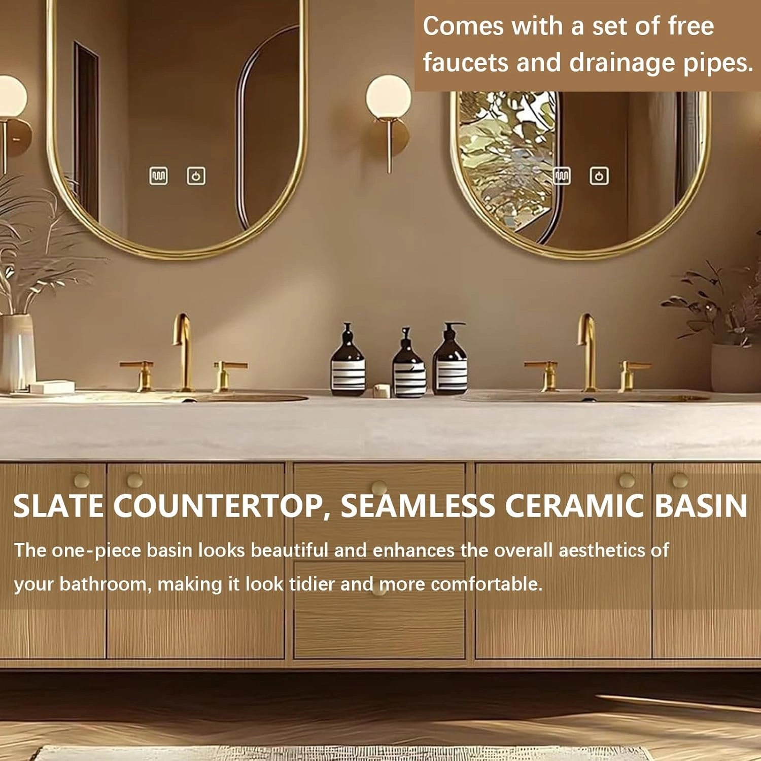 Exquisite Accessories: The hidden silent guide rail allows you to smoothly open and close silently to protect your cabinet by opening and closing; The refined details of the golden handle reflect the quality of the bathroom dresser and show the retro style