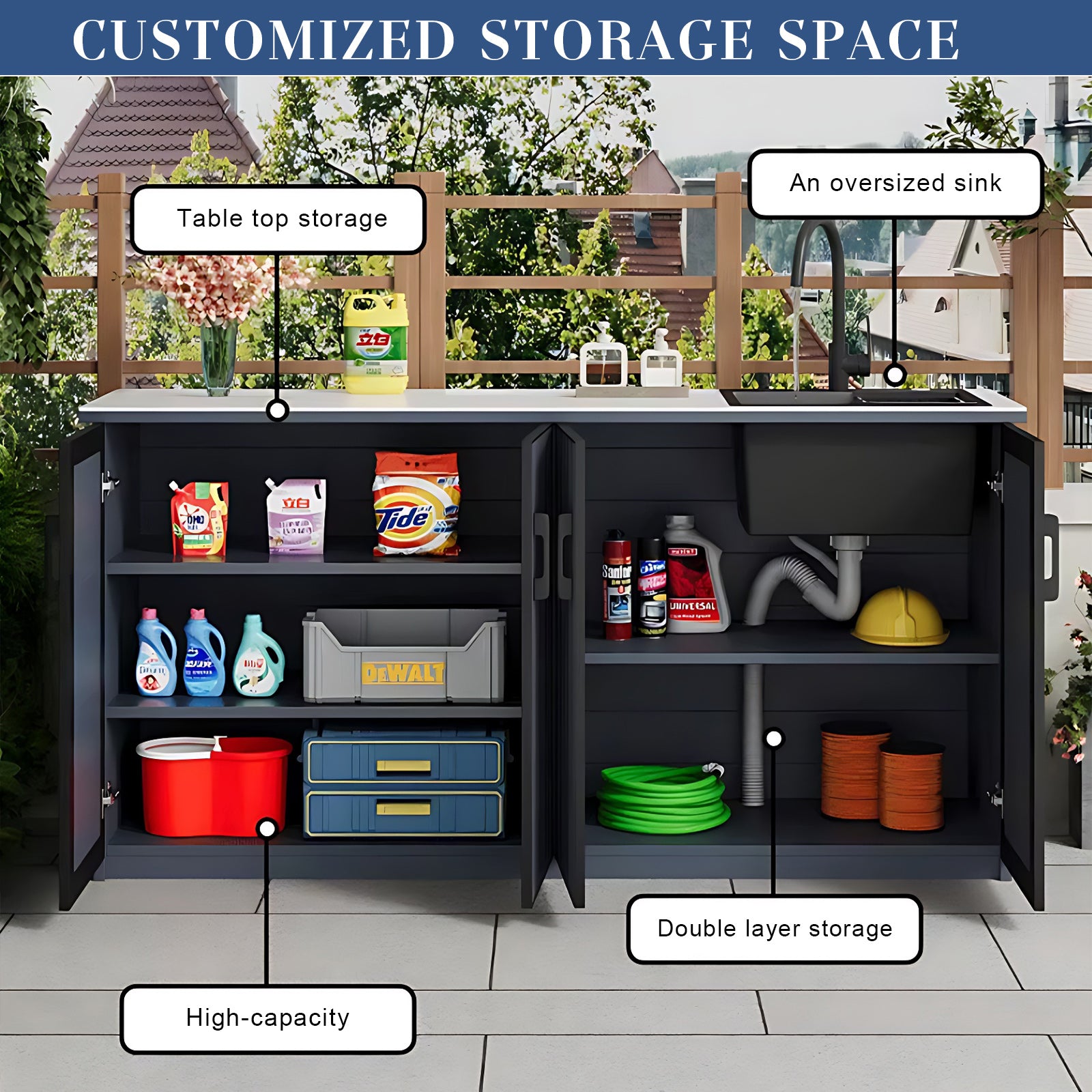 Ample Storage Space: Our outdoor sink cabinet offers generous storage capacity, allowing you to access and organize your belongings effortlessly. The flat, spacious countertop provides plenty of room for your items, making it ideal for outdoor balcony use and daily storage needs. With multiple layers for storage, you can keep your tools and essentials neatly arranged, eliminating clutter and enhancing both beauty and functionality.