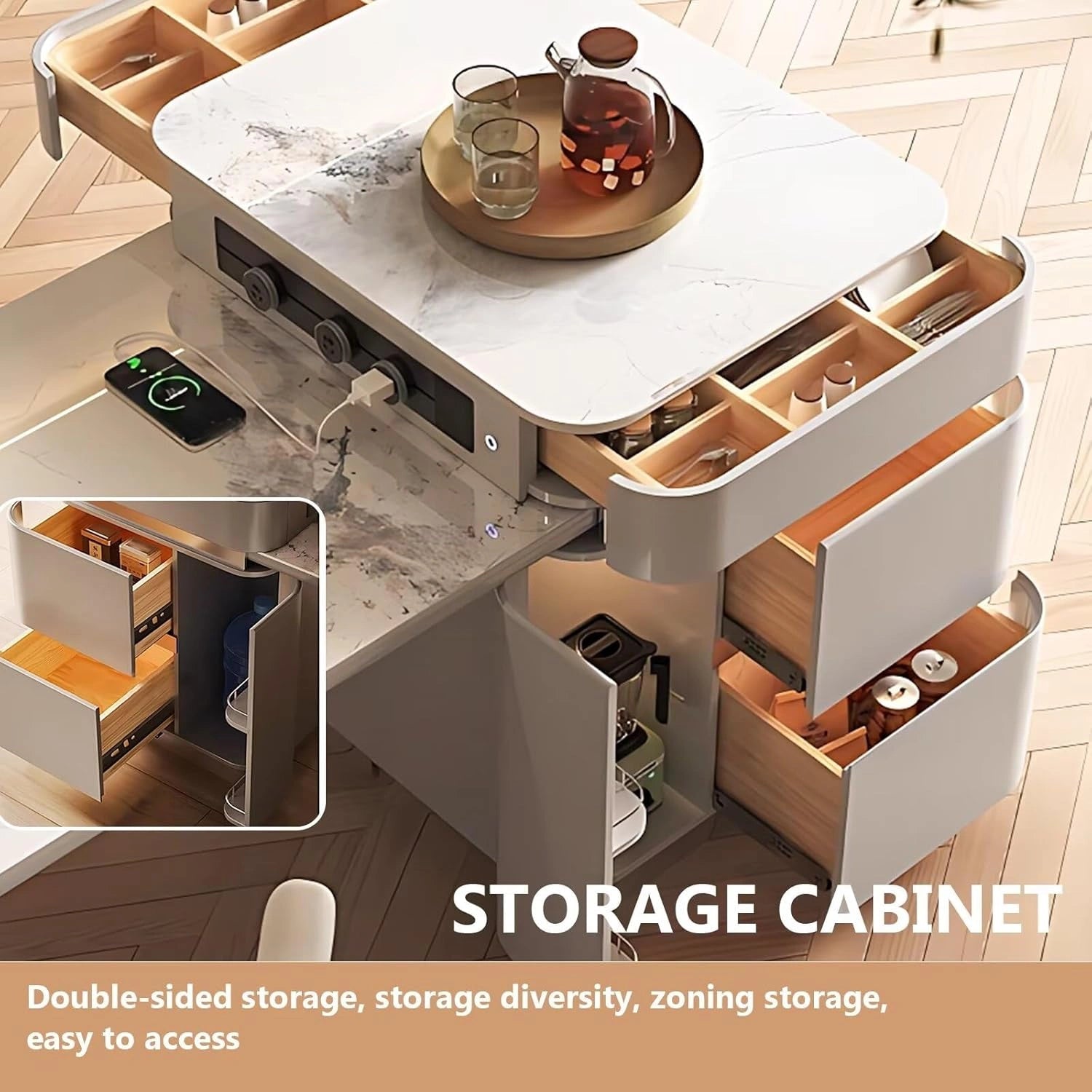 Light Luxury Style: Featuring a gray island and legs, the unique textured design of the tabletop shows exquisiteness and luxury within a modern minimalist style. The wheels at the bottom of the legs are thoughtful and convenient.