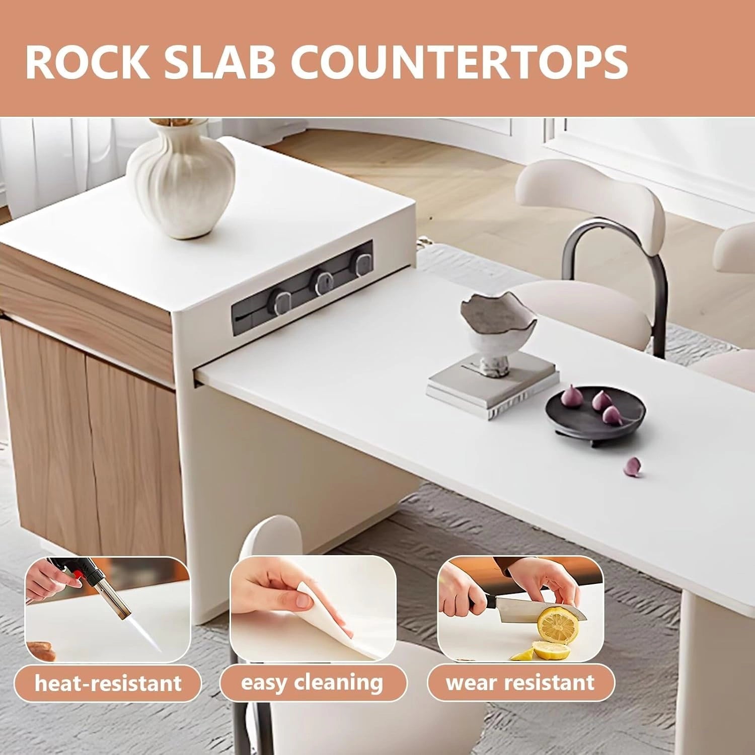 Beautiful and Durable Material: The tabletop is made of slate, which is extremely hard, smooth, and easy to clean. Solid wood provides stable and reliable support for the cabinets and table legs.