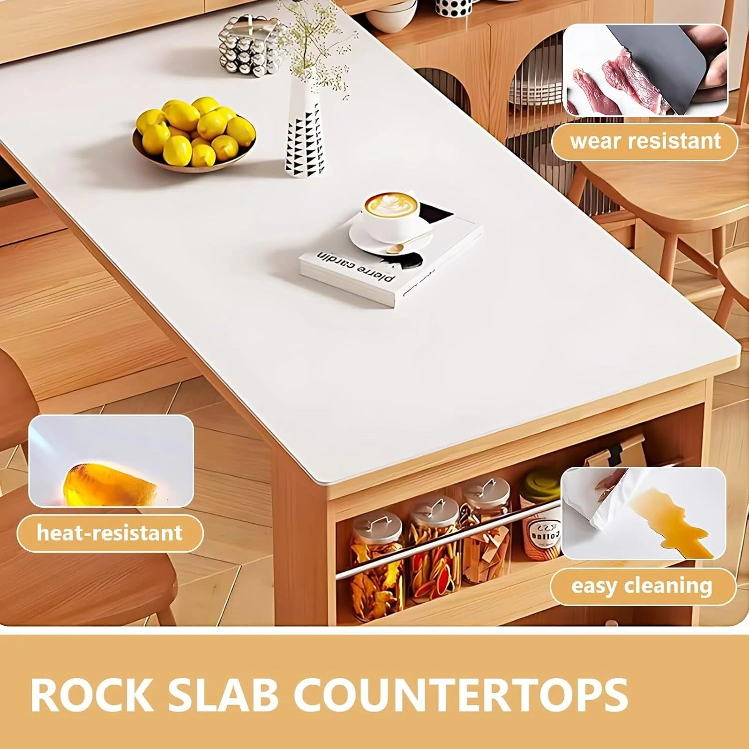Robust and Durable Material: The tabletop and island countertop are made of sturdy, deformation-resistant slate. The cabinet is crafted from solid wood for durability.