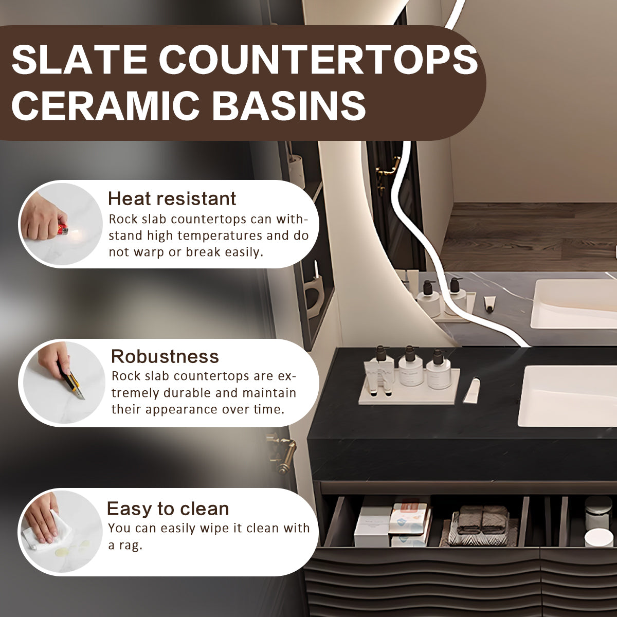 High-Quality Materials: The countertop is made of rock slabs with excellent texture, which are wear-resistant, scratch-resistant and stain-resistant. Paired with an exquisite glass sink, it not only enhances the overall sense of modernity and luxury, but also facilitates daily cleaning and maintenance, bringing users lasting beauty and practicality.
