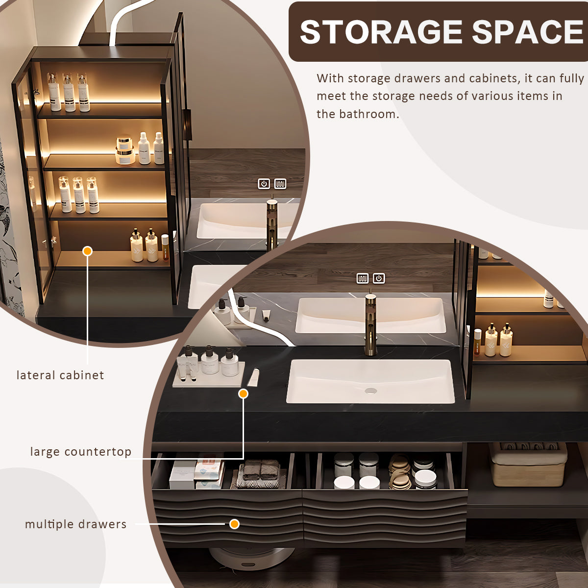 Spacious and Practical Storage Design: The cabinet part is carefully designed, including two large-capacity drawers and spacious countertops, with practical and beautiful mirror cabinets, providing ample storage space for daily necessities, which can keep the countertop neat and orderly, and take into account space utilization and visual beauty.