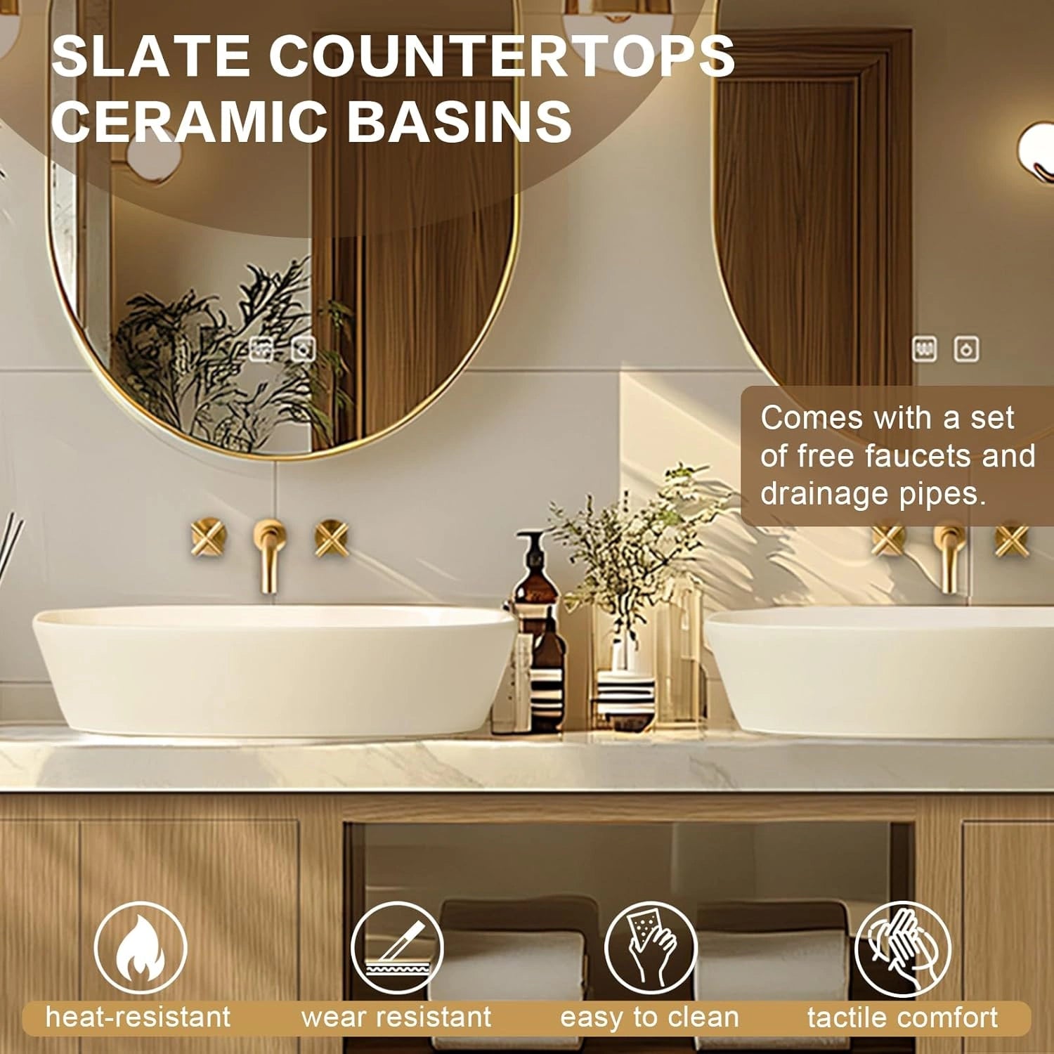 Sturdy & Durable Materials: The slate countertop boasts ultra-high hardness for long-lasting use; the ceramic sink features a smooth, easy-to-clean surface; the solid wood cabinetry offers reliable load-bearing capacity and excellent resistance to deformation.