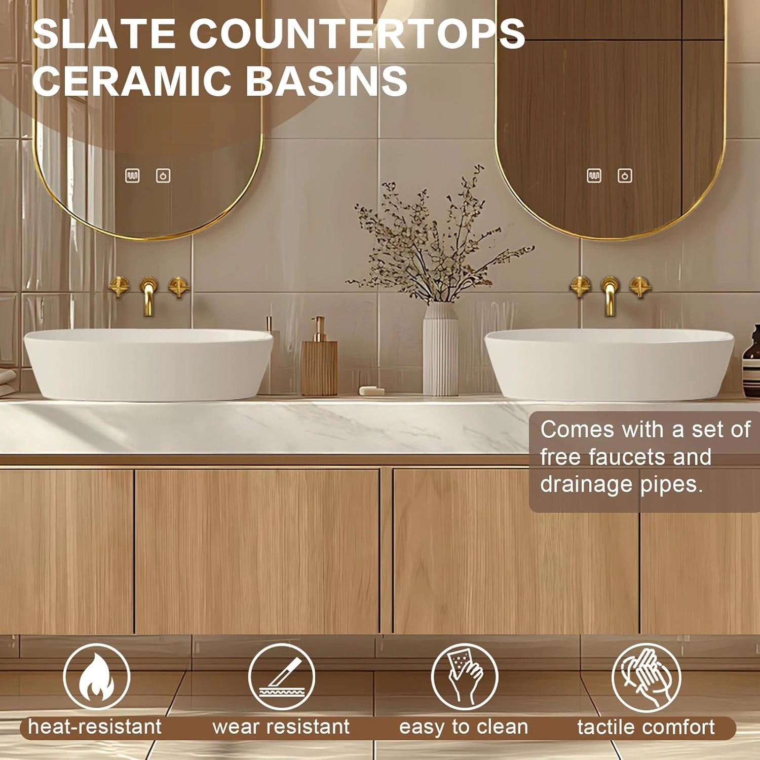 High-Strength & Durable Materials: The slate countertop boasts ultra-high hardness; the ceramic sink features a smooth, easy-to-clean surface; and the solid wood cabinetry has reliable load-bearing capacity and resists deformation for long-term use.
