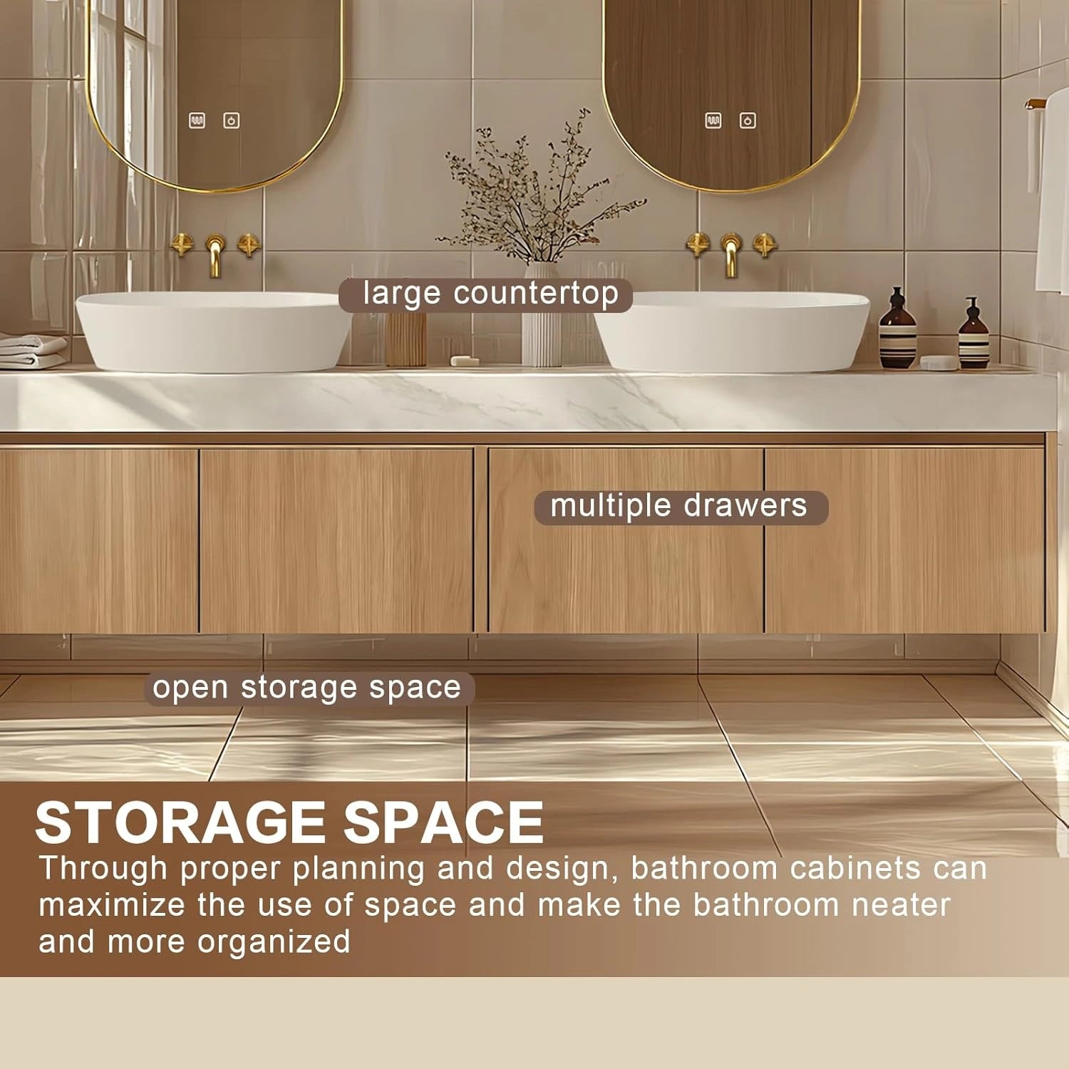 Double Sink Design: Its spacious layout allows two people to use it simultaneously, making busy mornings efficient and convenient—eliminating the rush of your daily morning grooming routine.