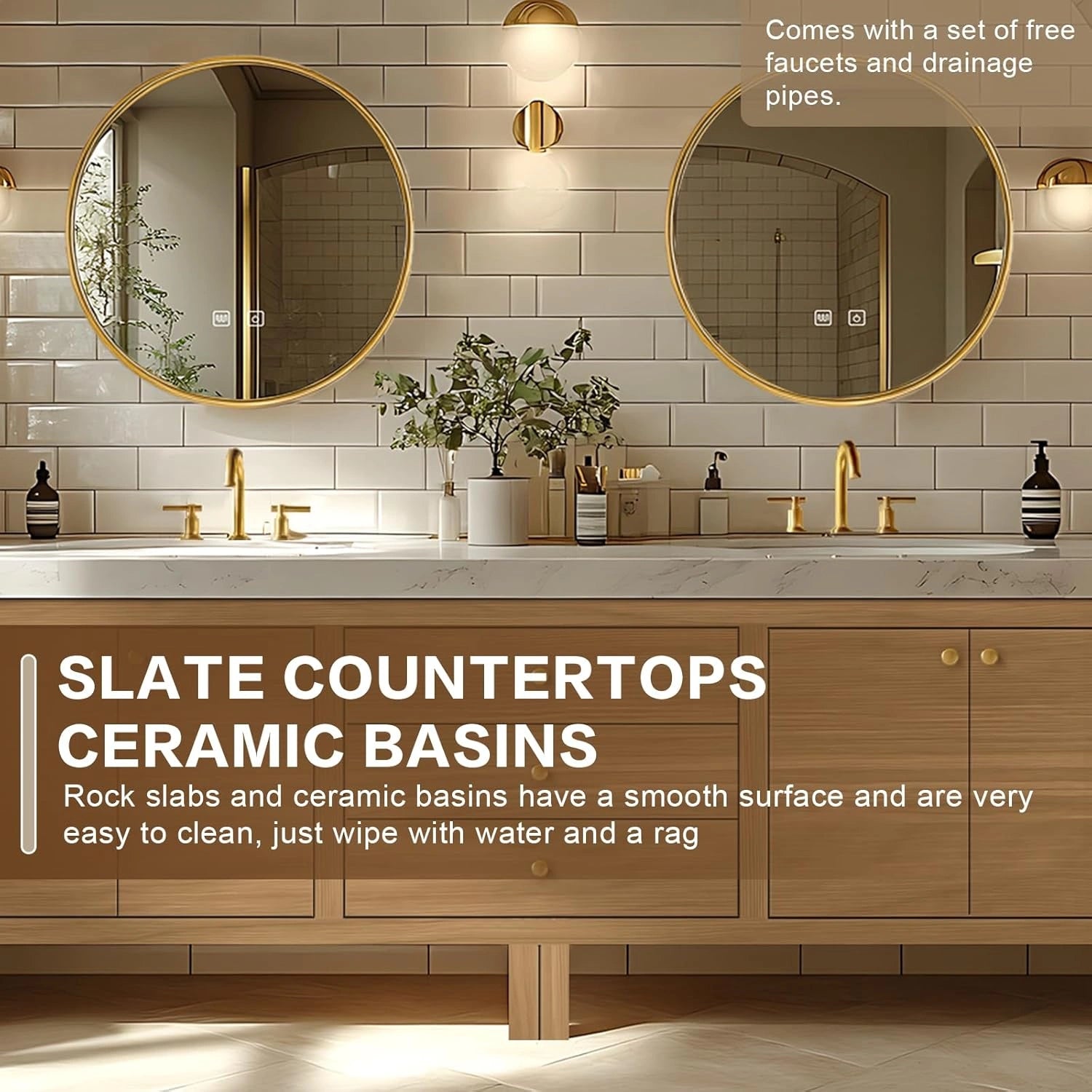 Sturdy and Durable Material: The slate desktop has ultra-high hardness; the surface of the ceramic basin is smooth and easy to clean; solid wood cabinets can bear a certain weight and are not easily deformed