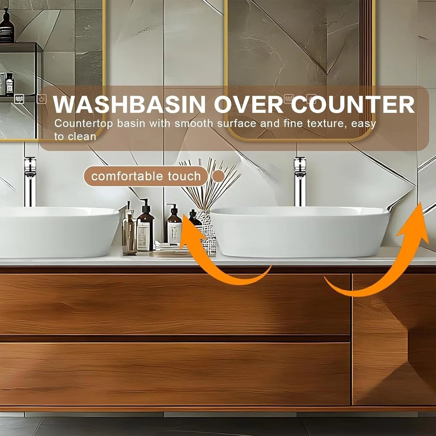 Above-Counter Sink: Mounted above the countertop, this sink effectively prevents water from splashing onto the surface. What’s more, it allows you to use the space without bending over, ensuring a more comfortable user experience while elevating the bathroom’s overall style.