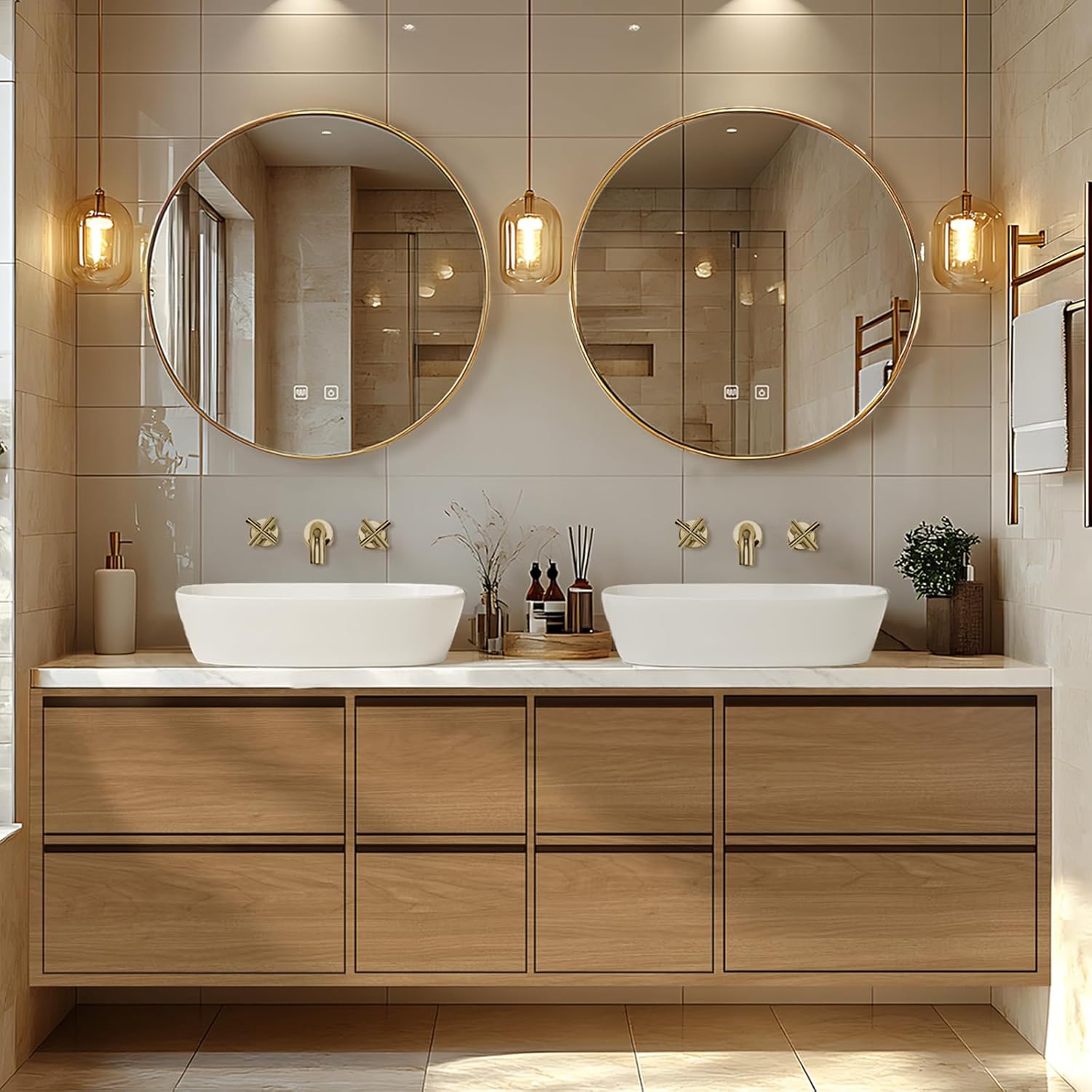 French Cozy Style: It blends French romance with a cozy home atmosphere. It uses white with wood colors to create a cozy yet elegant environment. The gold mirror frame and faucet design adds a touch of luxury and highlights your extraordinary taste