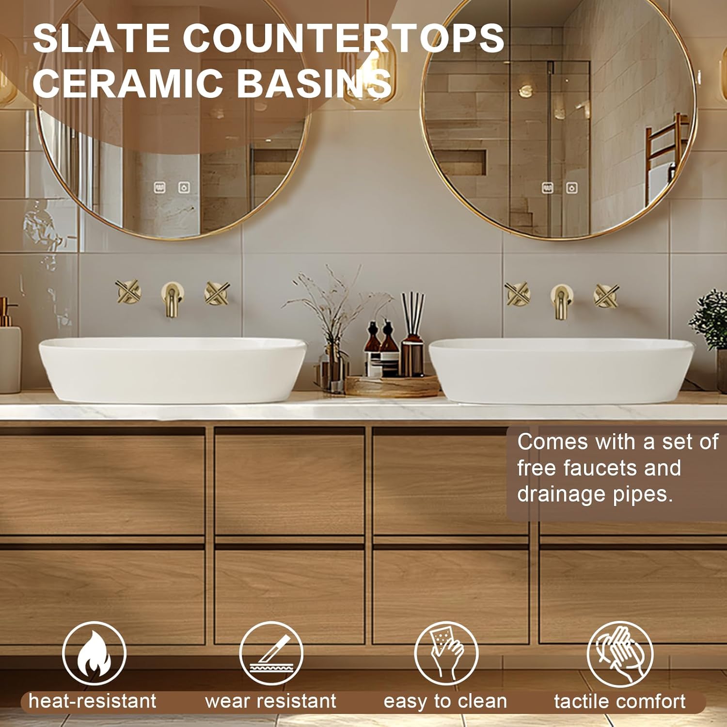 Carefully Selected Materials: The countertop is made of rock slab with double ceramic sinks, which is not only smooth and easy to clean but also has a premium texture. The cabinet at the bottom is made of solid wood, combining beauty and durability