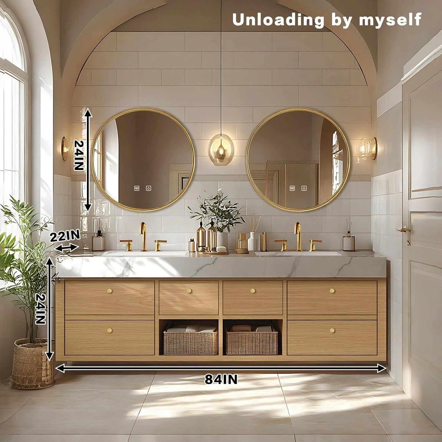 American Country Style: wood grain cabinets are simple and warm, as if telling a simple and quiet life; golden handle, exquisite and elegant; the golden mirror frame is matched with a round mirror to express romance and freedom