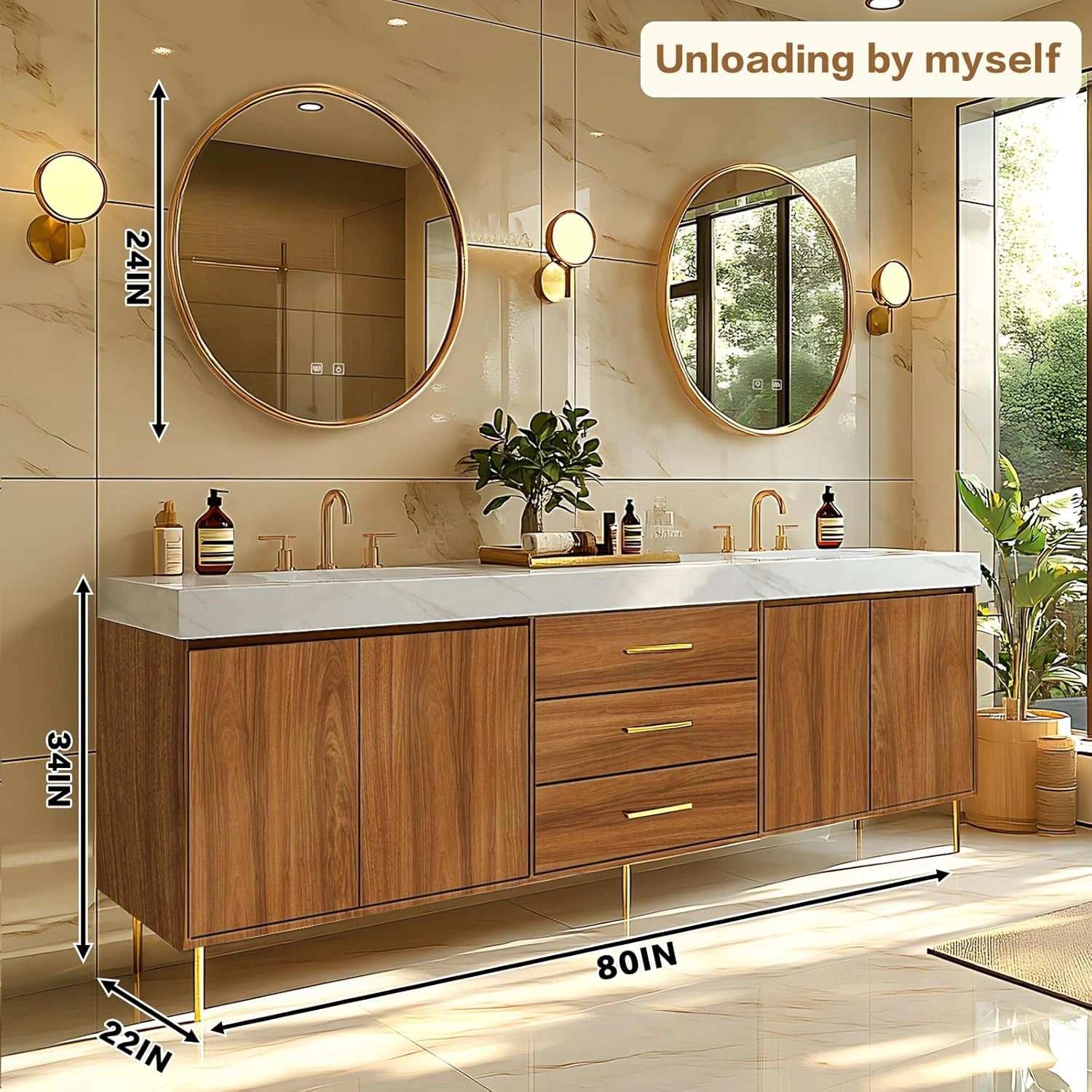 Exquisite Accessories: The hidden silent guide rail opens and closes smoothly and silently to protect the cabinet; the exquisite details of the golden small round handle reflect the quality of the bathroom dresser and show the retro style