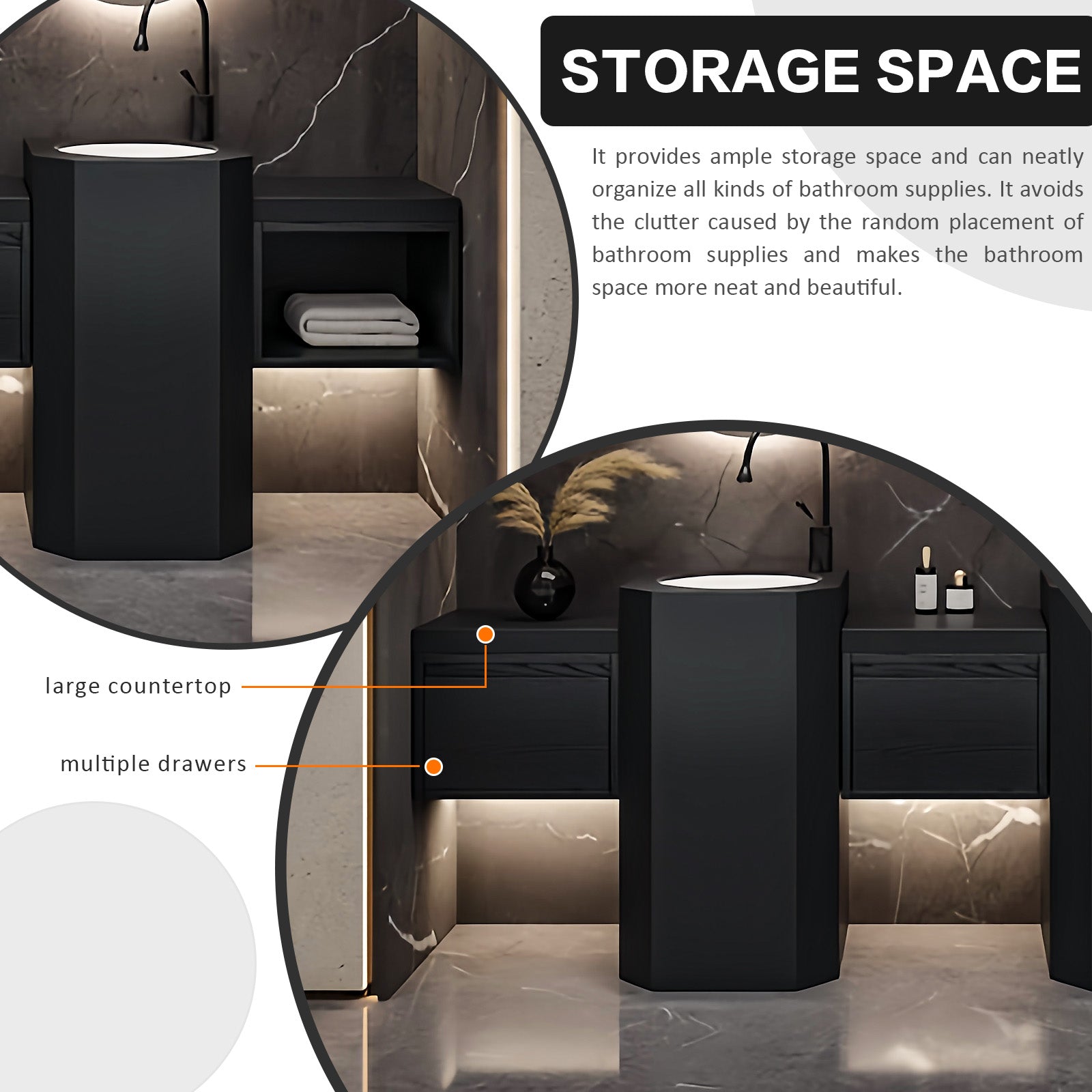 Spacious Storage Solutions: Say goodbye to clutter and expand your storage options to accommodate all your essentials with our innovative two-way expansion panel design. From oversized drawers to open storage shelves, our vanities provide plenty of room to keep everything organized, transforming your bathroom into a peaceful sanctuary. Designed for maximum convenience, our vanities enhance your storage experience, ensuring easy access to toiletries, towels and daily essentials.