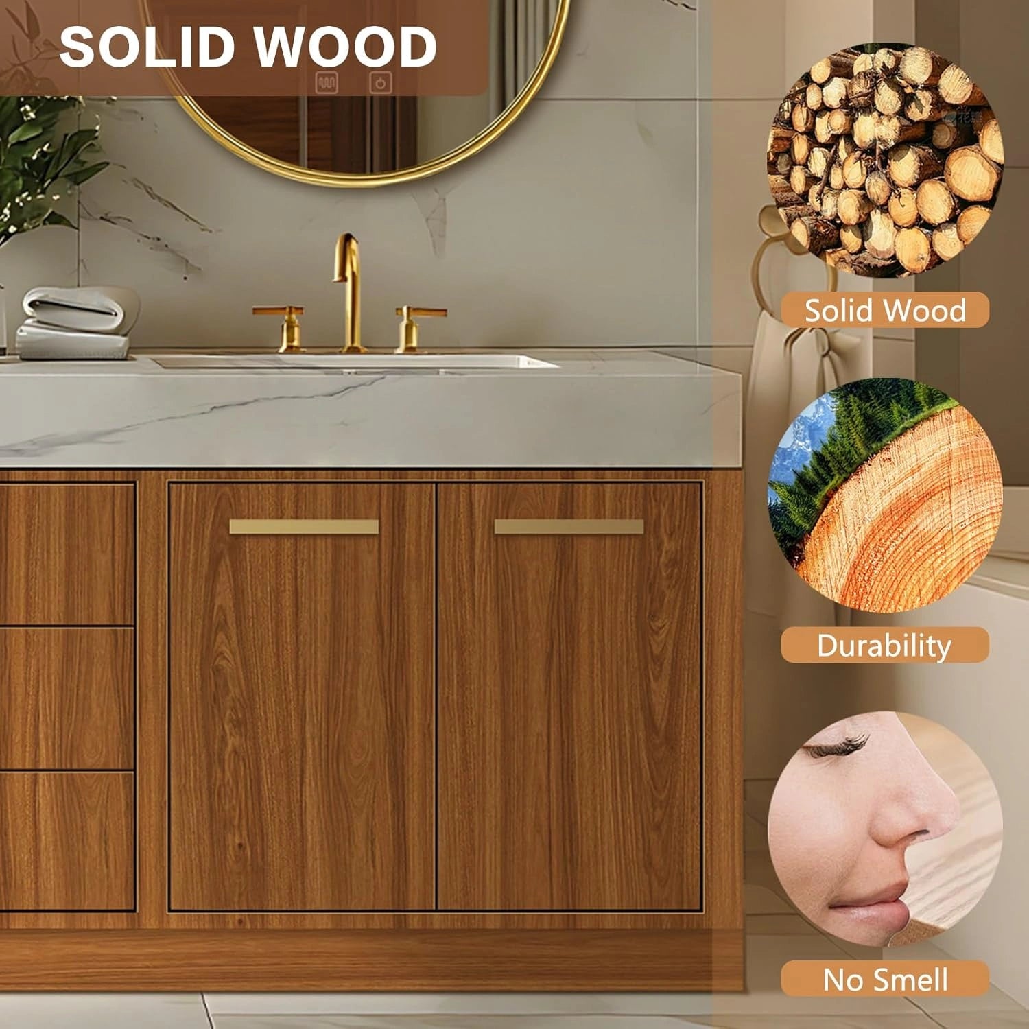 Fine Accessories: Hidden silent rails ensure smooth and quiet opening and closing, protecting the cabinet. The delicate small round gold handles highlight the premium quality and refined design of the bathroom vanity.