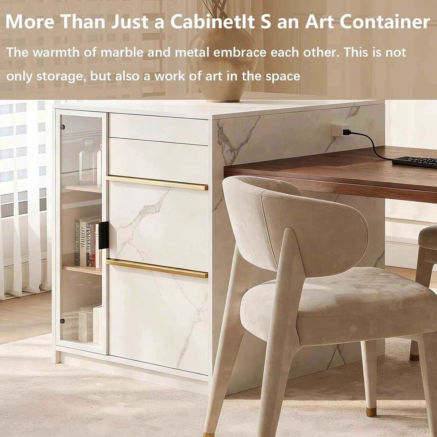 Durable Construction Materials: The tabletop is made of solid walnut wood, while the cabinetry combines sturdy engineered wood with marble veneer, ensuring a stable structure and long-term use.
