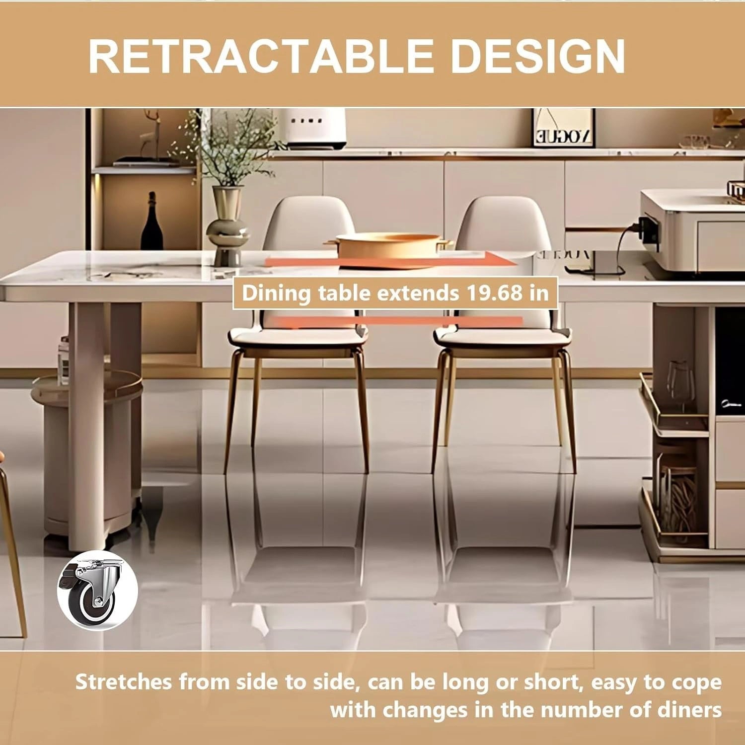 Extendable Dining Table: This design combines a dining table and kitchen island. The table can be flexibly adjusted according to the number of diners, making it suitable for daily meals and parties alike.