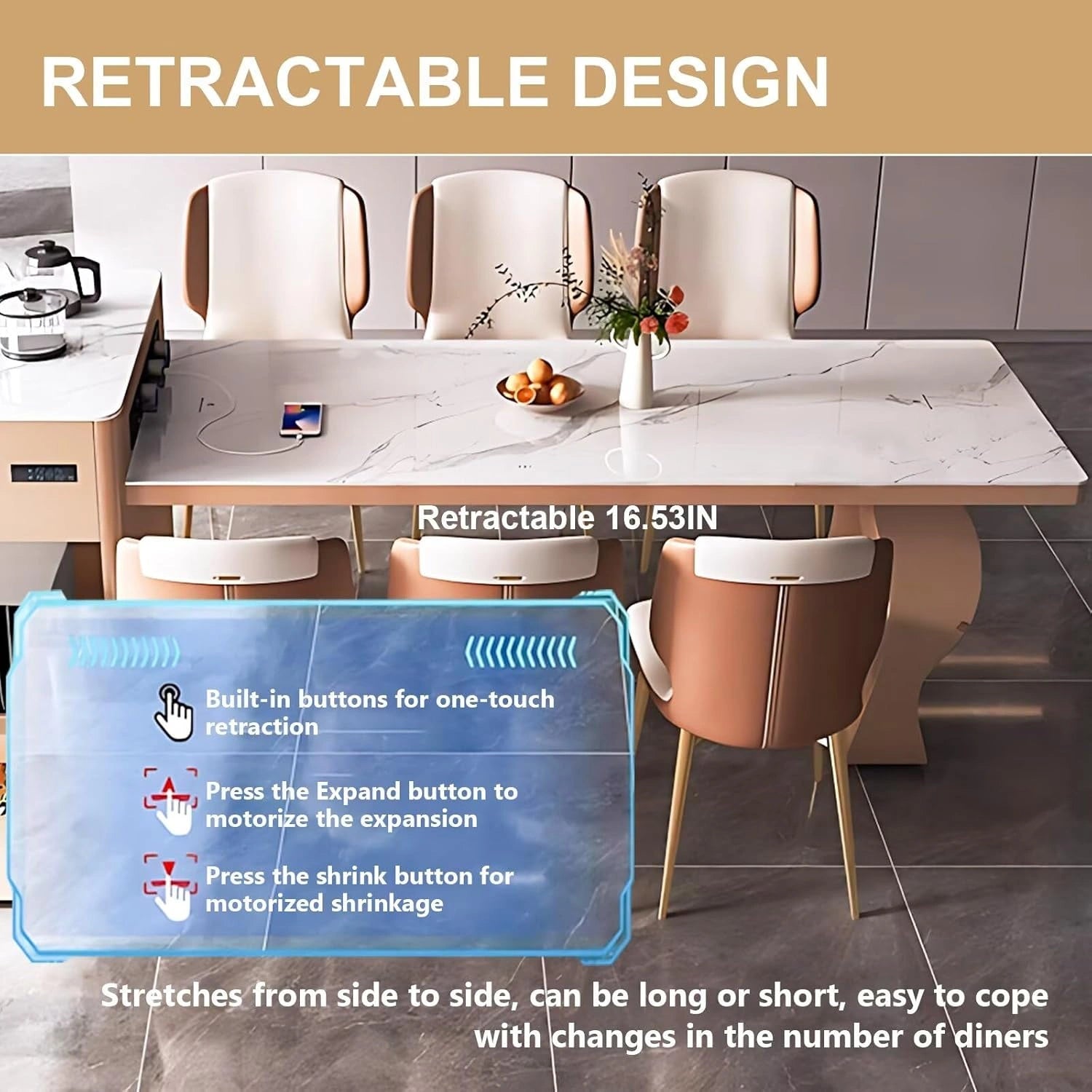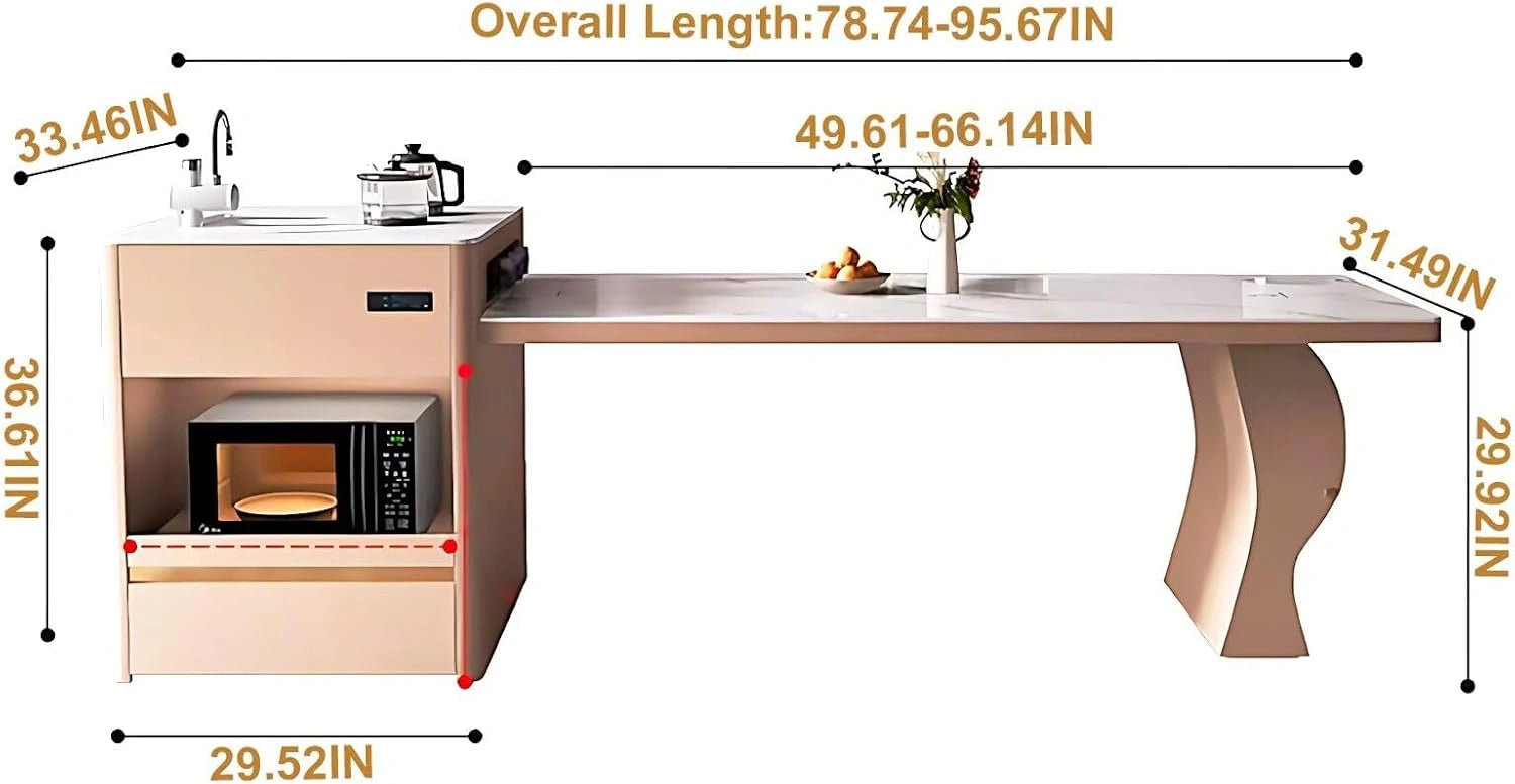 Extendable Dining Table: This design combines a kitchen island and dining table in one unit. The table size can be flexibly adjusted to fit the number of diners, making it suitable for both daily meals and gatherings.