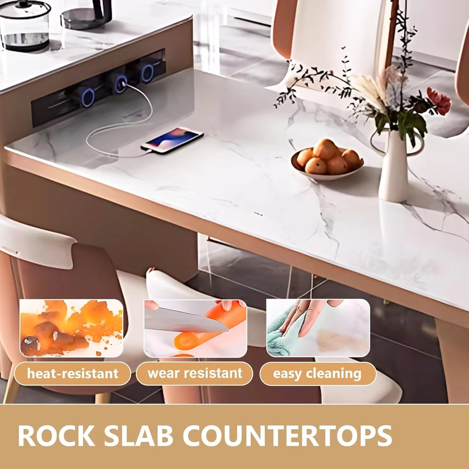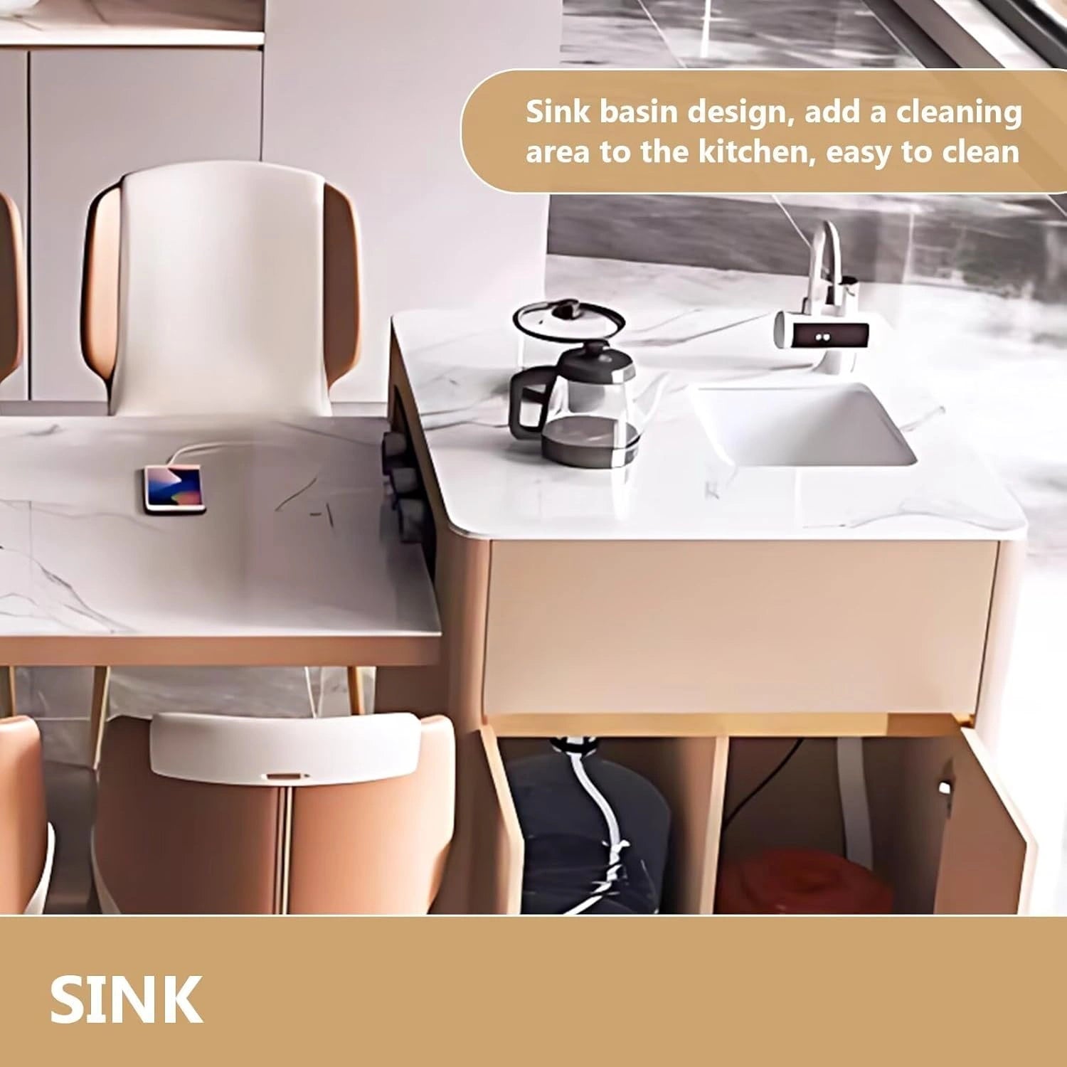 Modern Luxury Style: The kitchen island and tabletop form an integrated design with a warm brown-and-white color scheme. Light brown creates a cozy atmosphere, while the white patterned countertop adds a luxurious touch. The curved base is both delicate and practical.