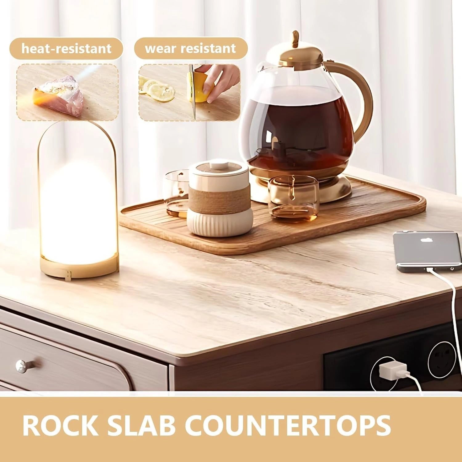Sturdy & Durable Materials: The tabletop is crafted from high-hardness rock slab for excellent deformation resistance. The cabinetry is made of solid wood with outstanding load-bearing capacity, and the glass doors are crystal clear, aesthetically pleasing and highly sturdy.