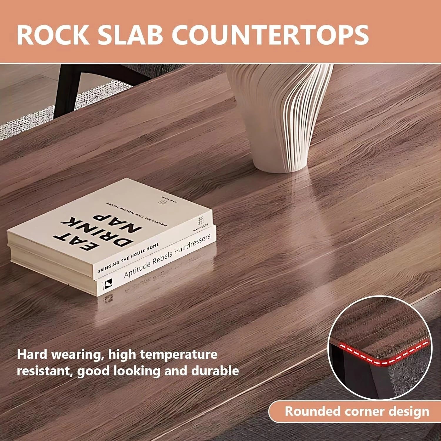 Modern Log Style: The island platform is integrated with the desktop, and the log pattern on the desktop is brown, which gives people a feeling of calm atmosphere; black and white match modern atmosphere