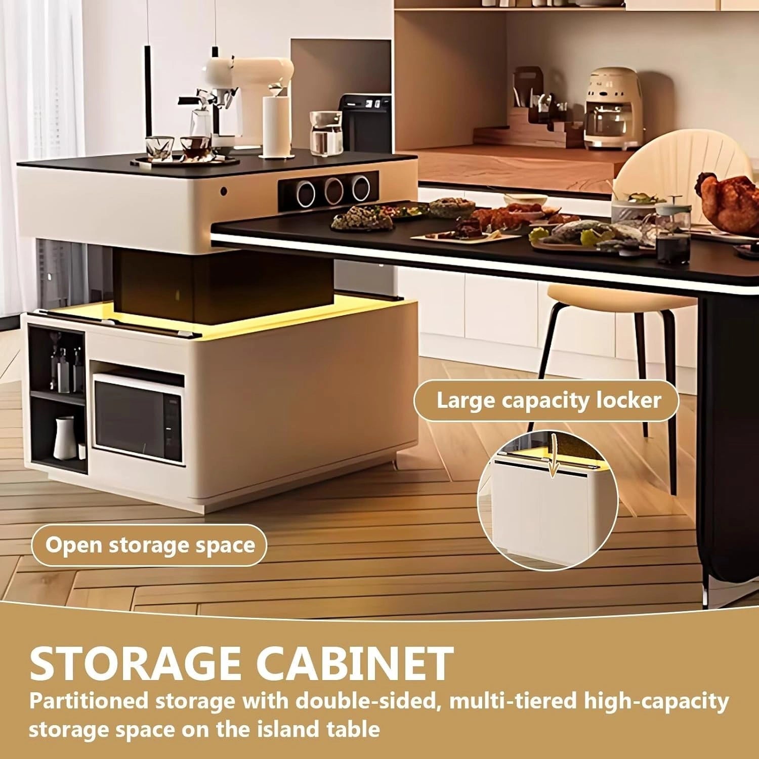 Light Luxury Style: This kitchen island features a sleek white design full of modern elegance. The built-in ambient light bar creates a warm atmosphere, and the transparent detail at the bottom of the table legs enhances its refined look.
