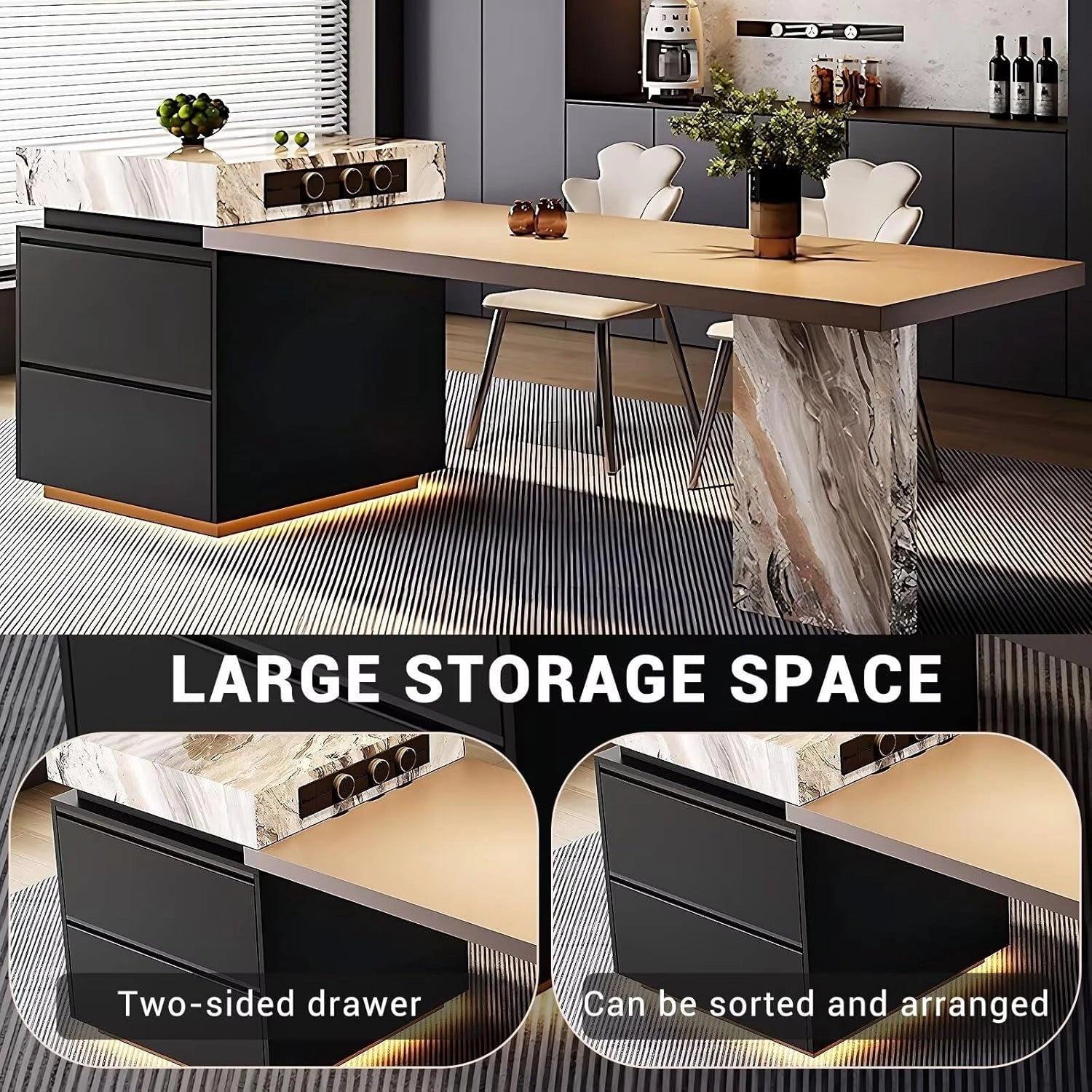Versatile Features: The island is equipped with convenient side power outlets for easy use. It also offers ample storage including drawers, and a ring of ambient lighting on the base enhances its modern, stylish appearance.