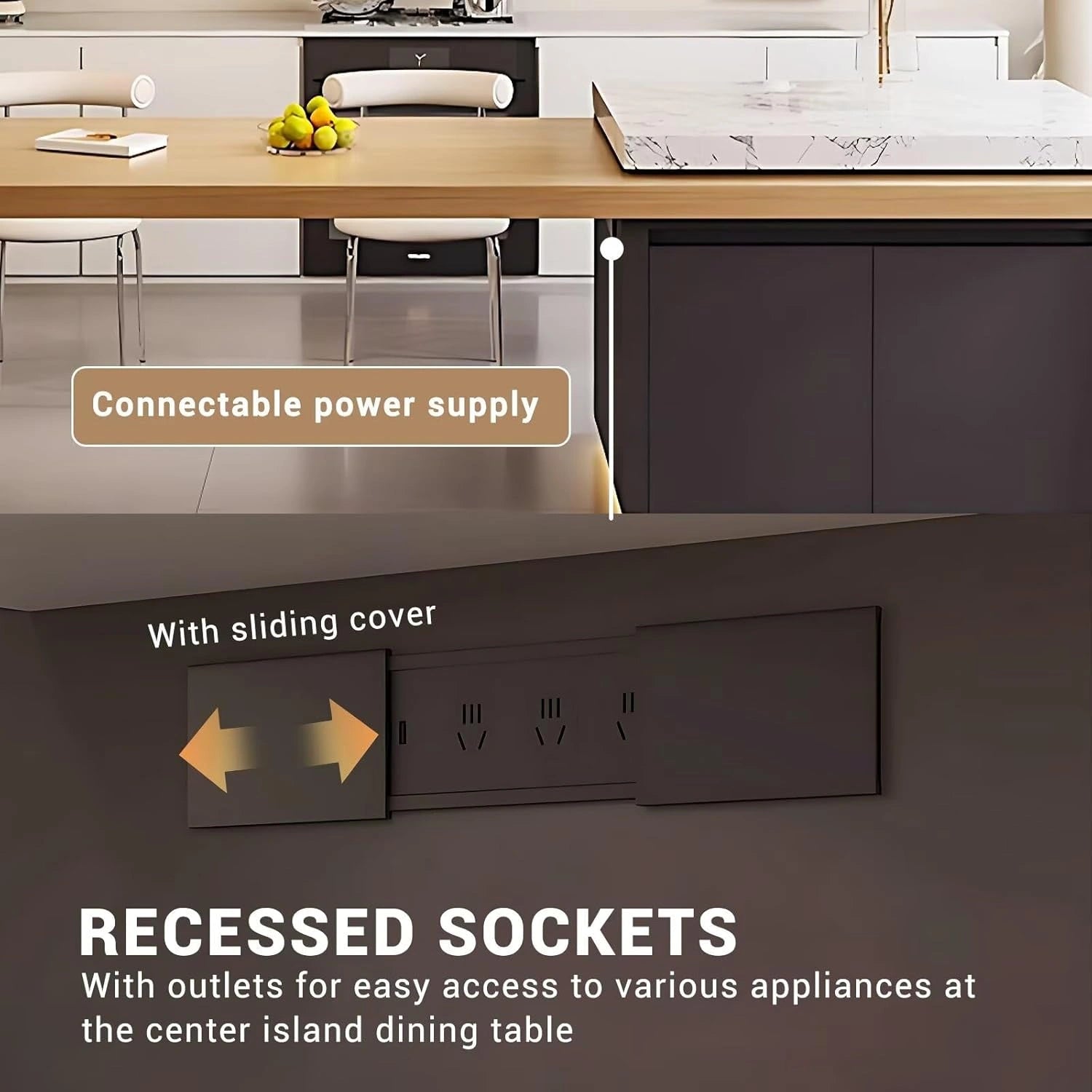Multifunctional Utility: The island integrates built-in storage cabinets, providing ample space to organize daily essentials. Side-mounted sockets are also included to conveniently power basic household appliances and other electronic devices.