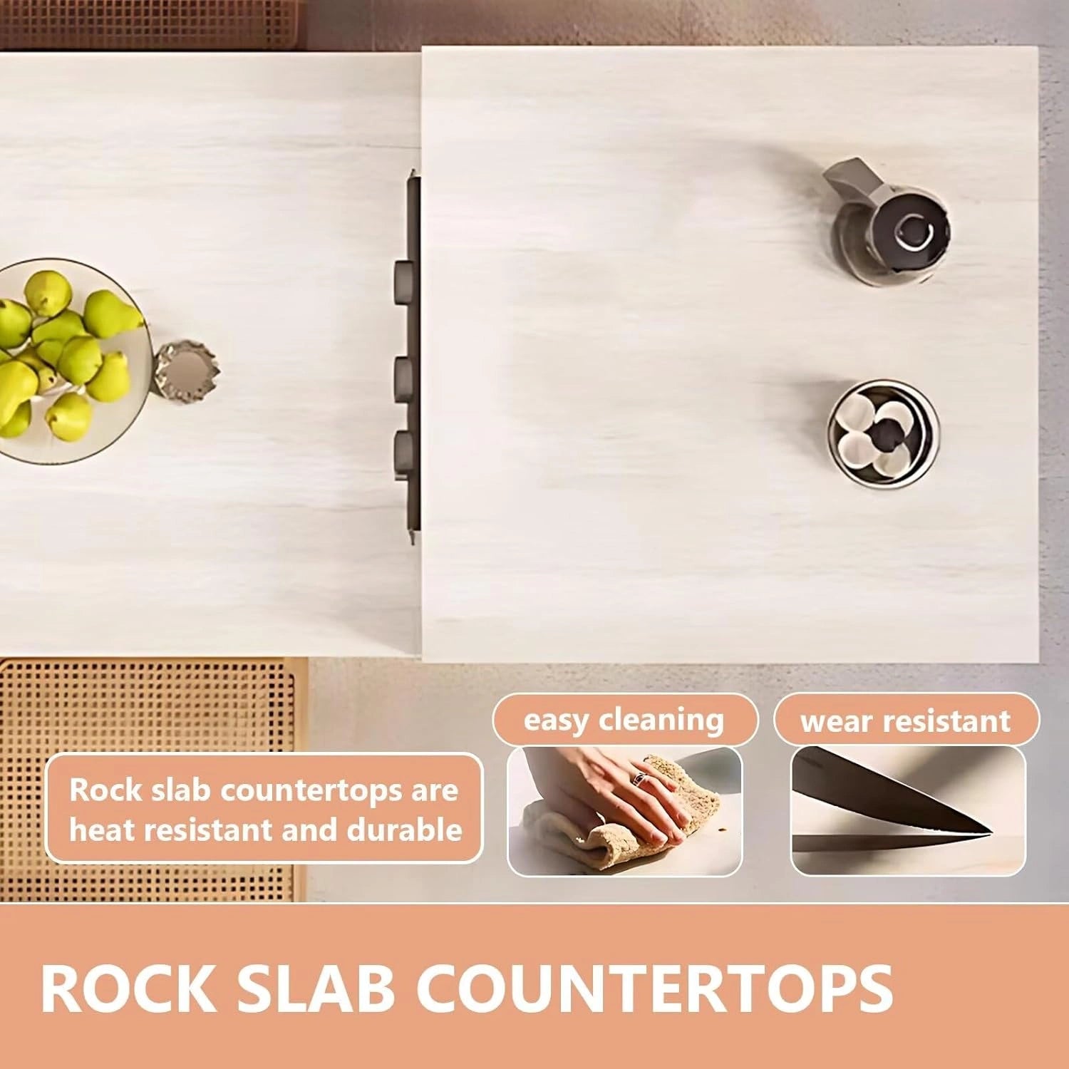 High-Quality & Stable Materials: The island countertop is made of rock slab, which is extremely hard and deformation-resistant. The cabinet and table legs are solid wood with excellent load-bearing capacity.