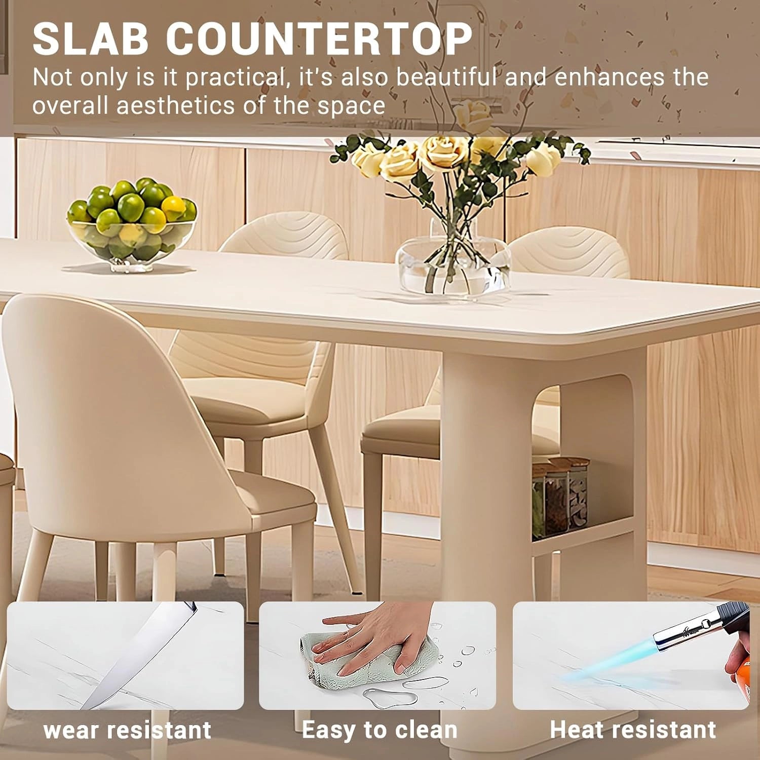 Exquisite Craftsmanship: The heat-resistant stone is used in making the tabletop so it has a smooth texture and is easy to clean and extremely wear-resistant. The texture is unique and versatile. The cabinet body is made of solid wood with robust durability and excellent load bearing capacity.