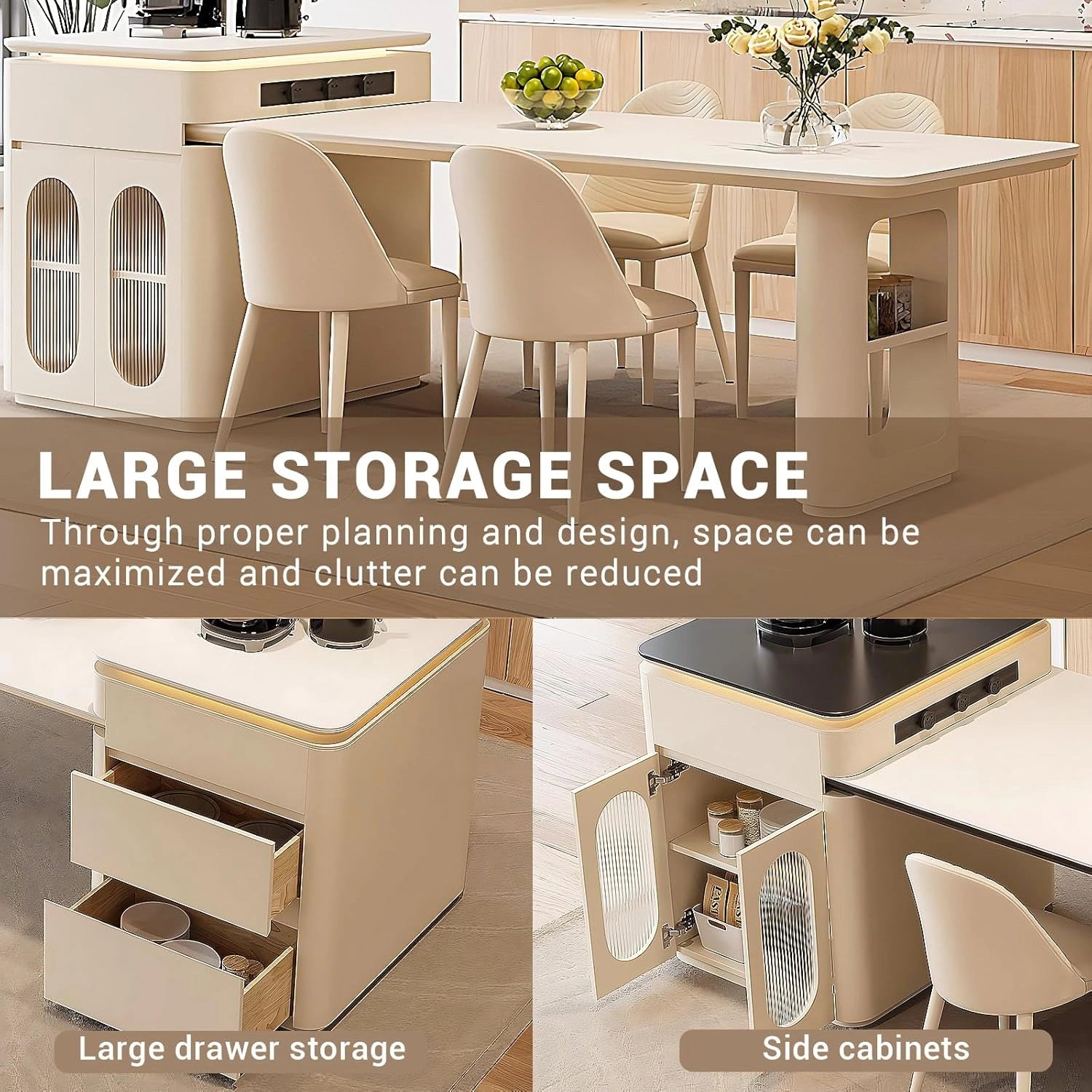 Wide Storage Space: There is an open compartment on the side of the kitchen dining table island where you can put your spices and kitchen essentials, you can also get a storage cabinet to store your belongings at living room, everything in place. You can also place daily items, such as teapots easily on the table, it is simple and convenient to do that.