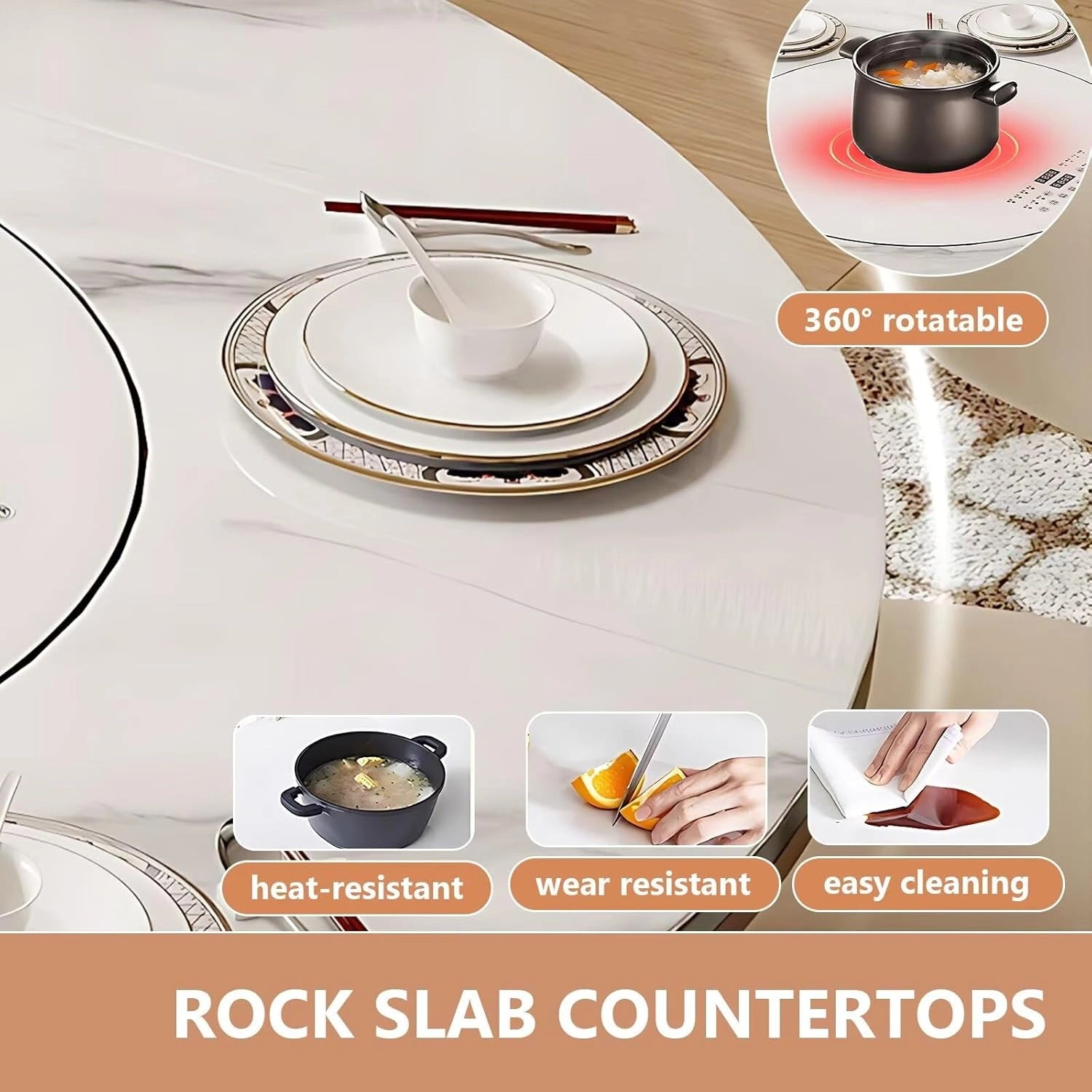 Sturdy & Durable Materials: The tabletop is crafted from rock slab—an extremely hard material that resists deformation. Both the cabinet and table legs are made of solid wood, delivering excellent load-bearing capacity, while the stainless steel base ensures overall stability.