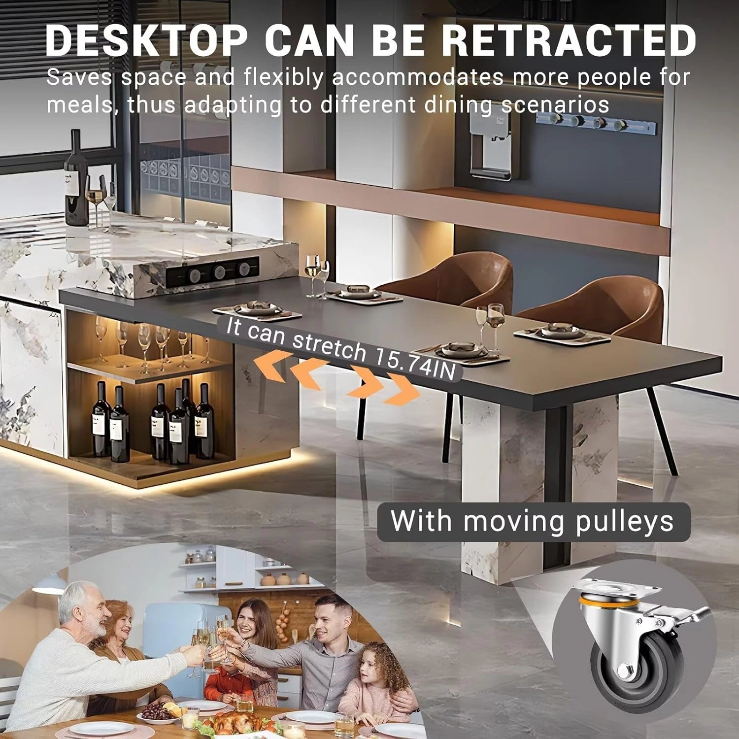 Multifaceted Functions: A ring of ambient lighting decorates the base of the island, adding an extra touch of charm. The table legs are equipped with wheels for easy movement, and the side socket enhances practicality.