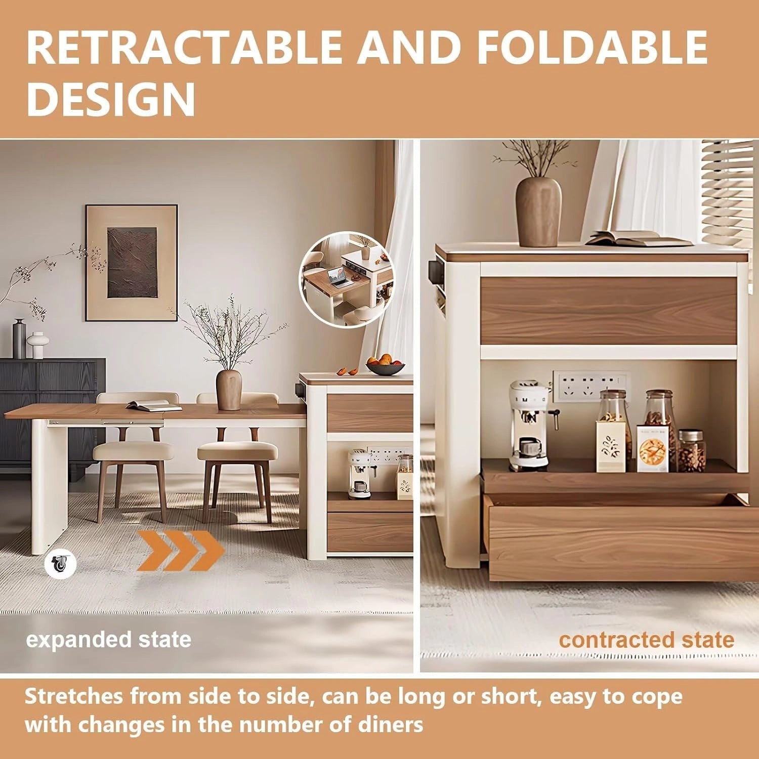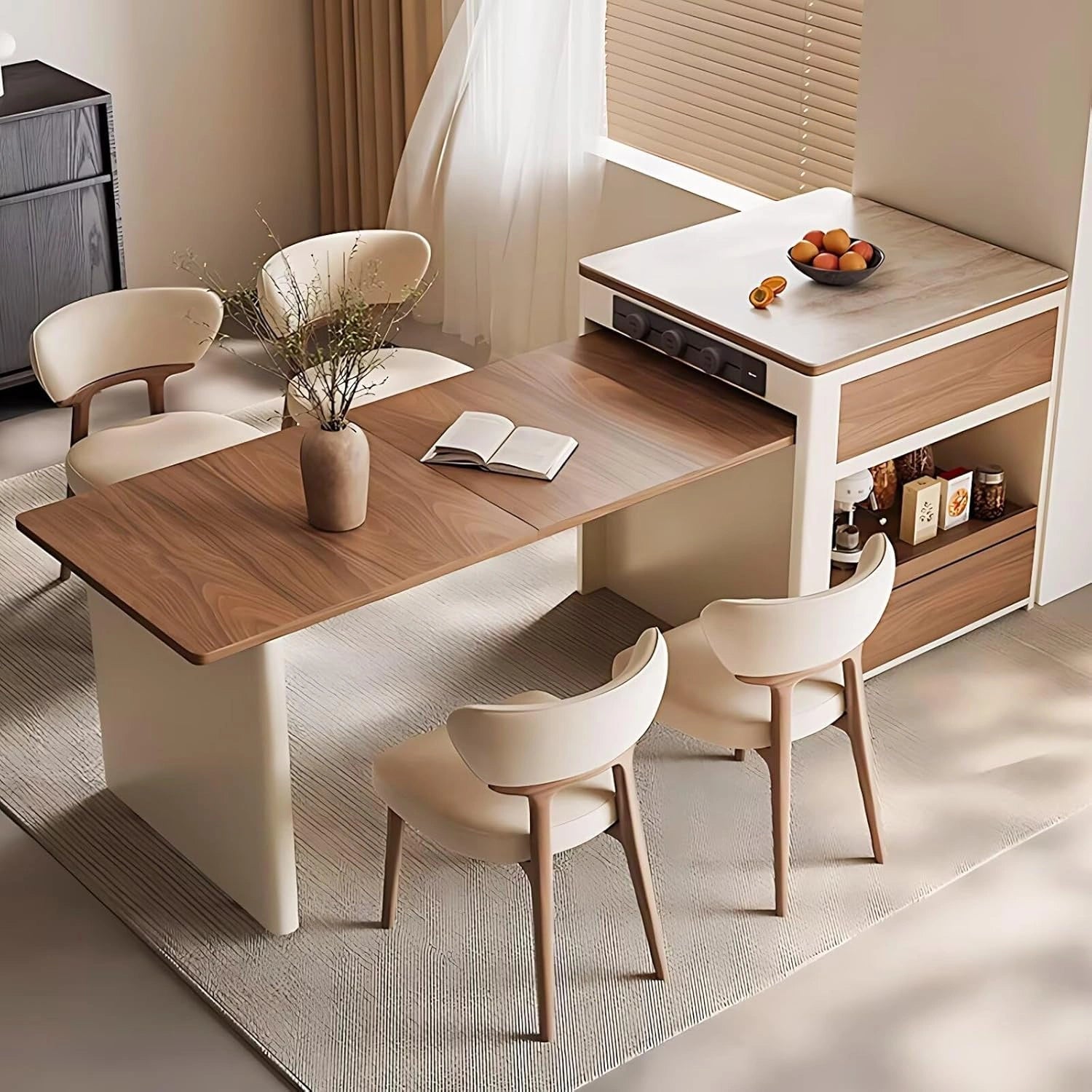 Retractable Dining Table: This design integrates the kitchen island and dining table in one piece. You can adjust the table size according to the number of diners, making it ideal for both daily meals and parties.
