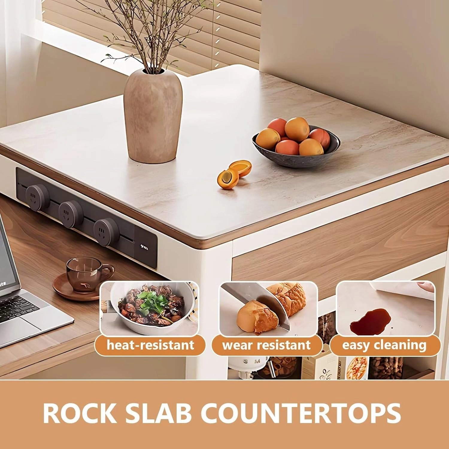 Large Storage Space: The double-sided cabinet provides generous storage, and open compartments offer easy access to frequently used items. The wide countertop can also hold small appliances.