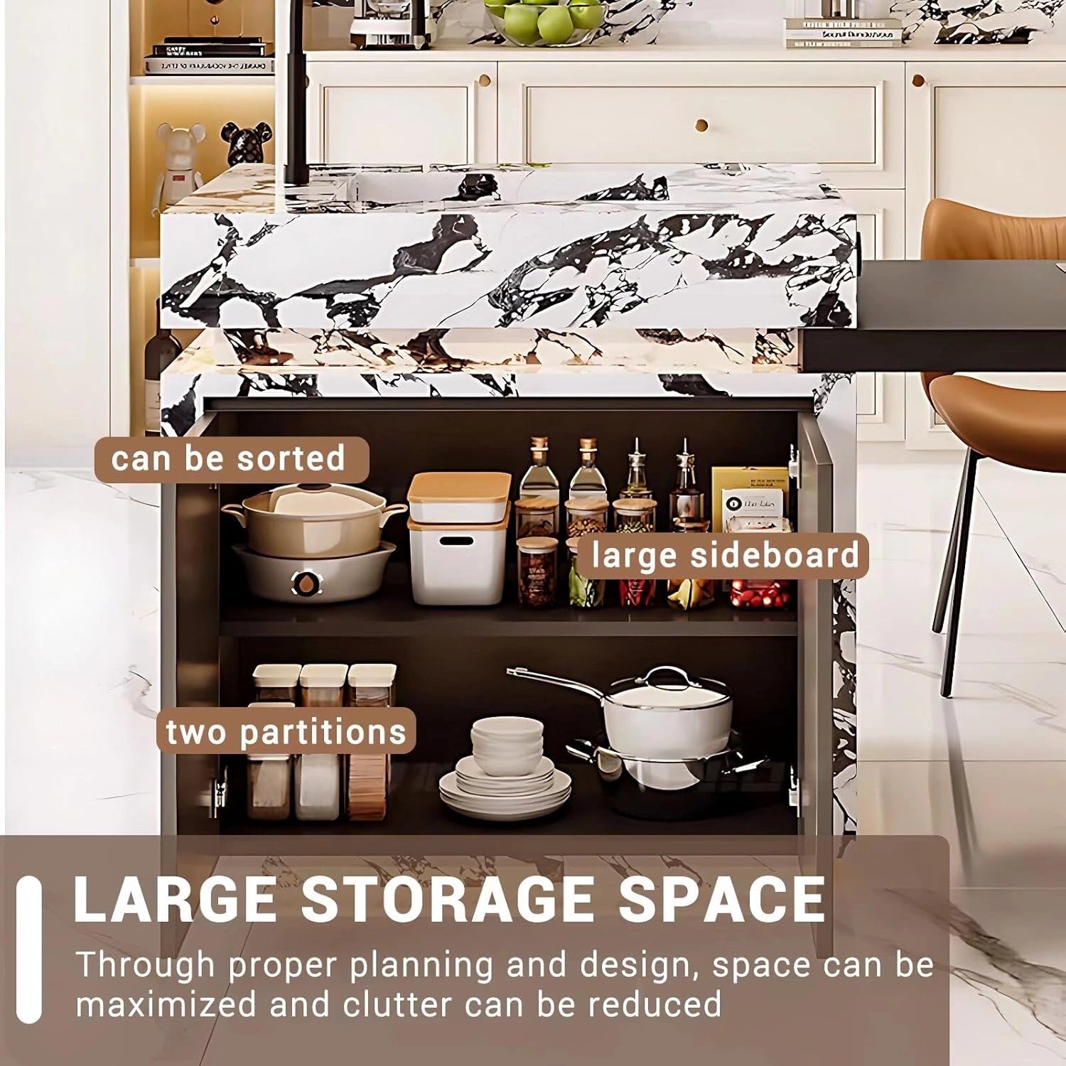 Ample Storage Space: The island cabinet features spacious storage compartments, offering plenty of room for all your essentials and maximizing practicality. The generous island countertop also provides ample space for stowing cleaning utensils and daily necessities.