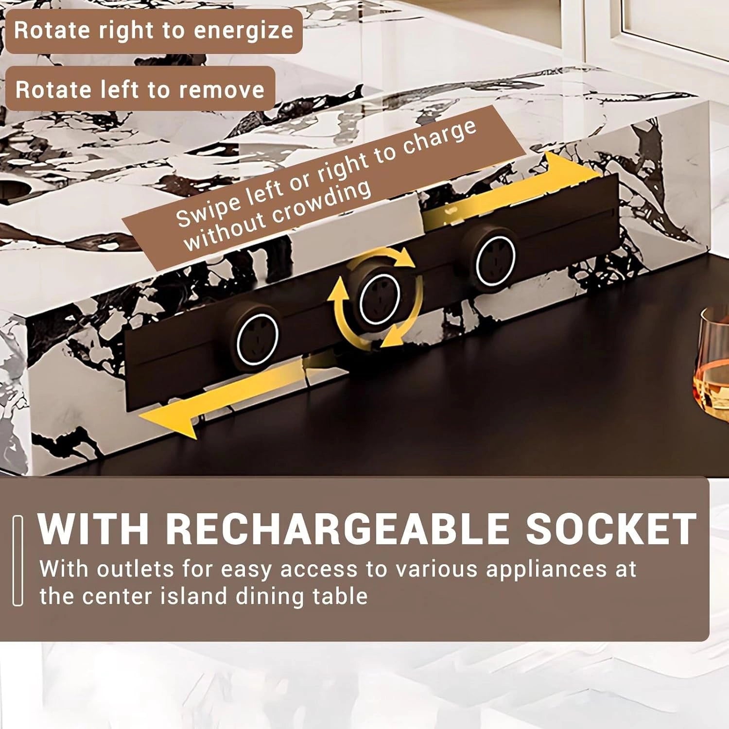 Thoughtful Design Features: Soft ambient lighting is integrated at the base of the island for a warm glow. Conveniently placed side sockets add ease of use, and the table legs are fitted with smooth-rolling casters, making table extension effortless and seamless.